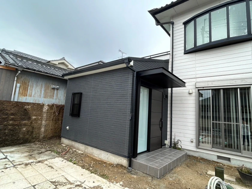 平屋増築ではありませんが、2階建て住宅の1階部分に「差しかけ増築」にて玄関増築をした事例です。