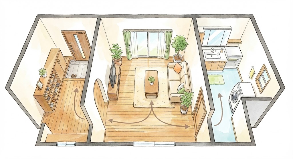 たとえば「玄関→リビング→洗面室→玄関」のように家の中をぐるりと回れる間取りにすれば、よりスムーズに移動できるでしょう。