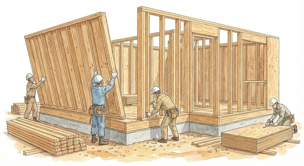 壁で建物を支える構造で、ツーバイフォー工法とも呼ばれます。壁・床・天井がそれぞれ、木材と合板で作られた大きな一枚の「面」になっているため、高い耐久性と耐震性を備えています。