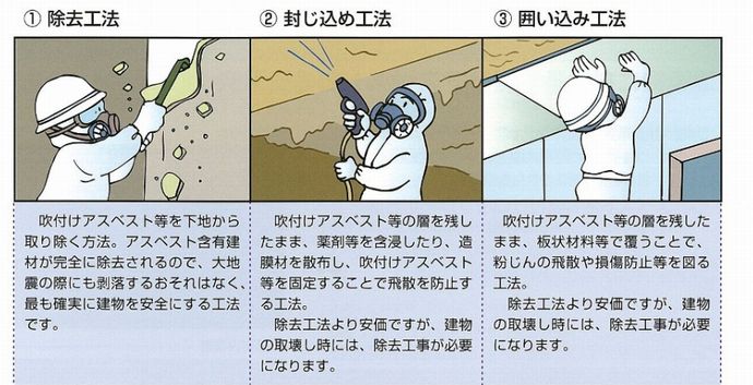 アスベストを含有している建物は専門業者に依頼して適切に処理することで、安全に除去・解体できます。処理方法は、建物の解体を予定している場合は除去工法で完全に取り除くのが適しています。