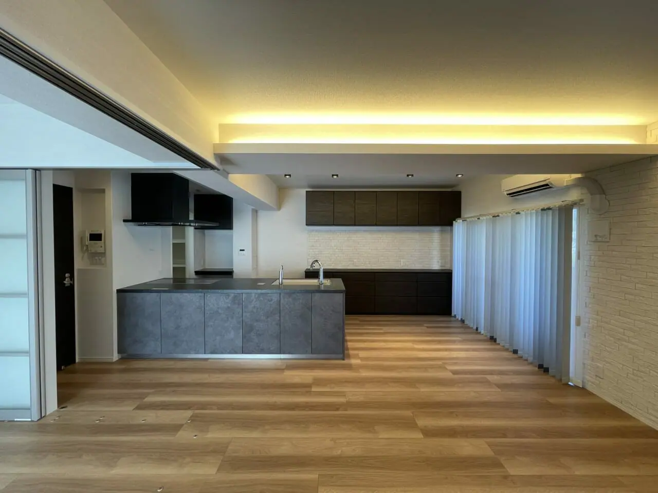 築20〜30年ほどのマンションで「間仕切り壁を出来るだけ撤去して、可能な限り広い空間を確保したい」と相談があったことがきっかけでスタートしたリノベーション物件です。マンションの構造上、天井にどうしても「梁」が出てきてしまうので、照明や間仕切り建具工事も含め、細かく寸法を計算して施工しました。