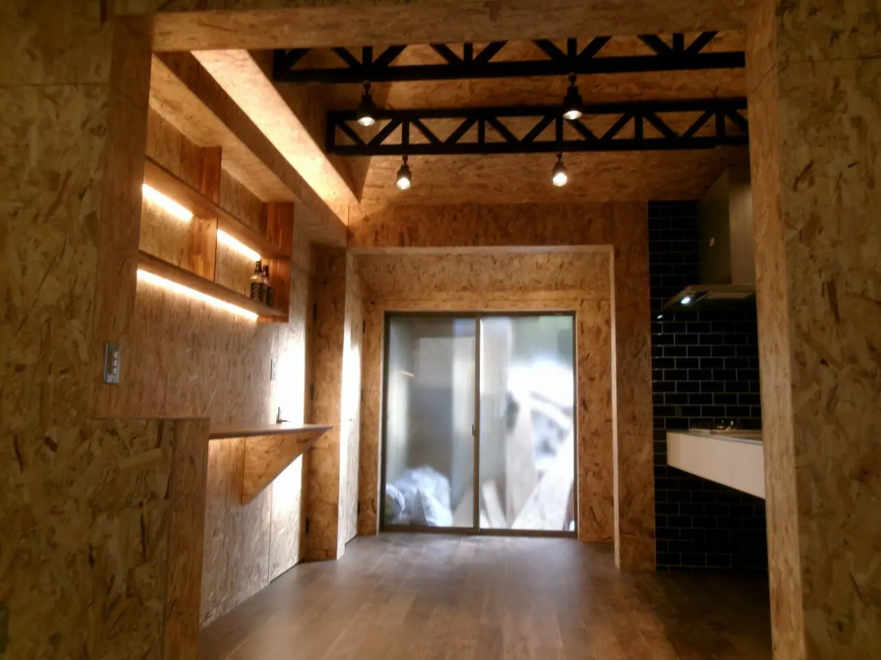 明治時代に建てられた長屋で、以下のリノベーションをおこないました。小さな木が重ねられている「OSB合板」で壁をつくり、個性的なデザインのLDKに仕上げています。