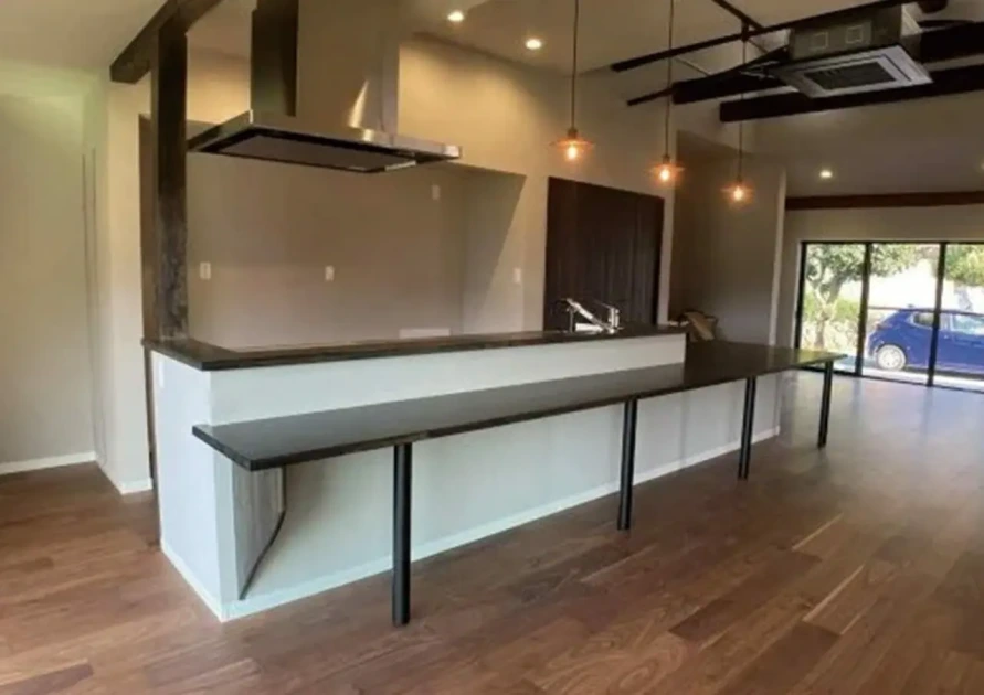 既存の古民家は、キッチンが独立した部屋となっていたので、キッチンとダイニング・リビングとの仕切り壁を撤去。対面キッチンに変えて、開放的なLDKに仕上げました(施工:ミサワホーム中国)。