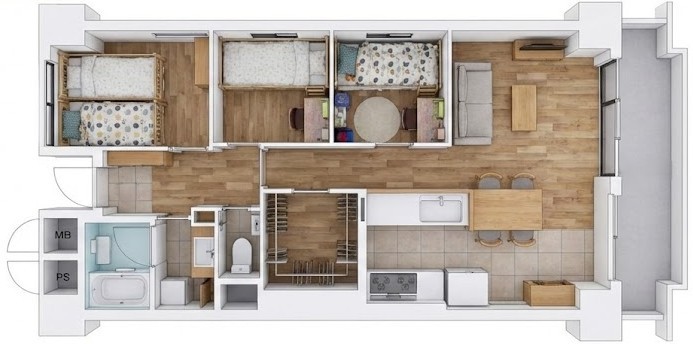 60㎡のマンションに暮らせる人数は、夫婦と子供2人程度の4人家族です。