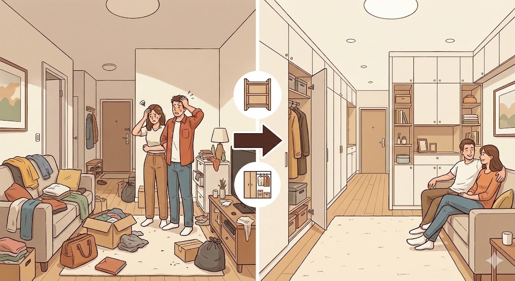 60㎡のマンションでは、部屋の広さや間取り数が限定されています。部屋の広さや部屋数を優先するがあまり、収納スペースが足りなくなり、物がリビングや自室に散らばる原因になります。