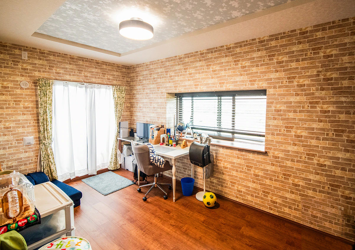 壁に使用されているタイル調の壁紙は、室内の雰囲気を一新させました。細部にわたる提案をおこない、家族の成長も見据えたプランが完成しました(施工:木下のリフォーム)。