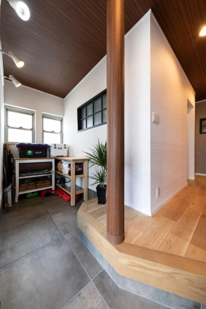 玄関のスペースは広く確保したので、一画にオープンの可動棚を設置し、シューズクローゼットとしました。