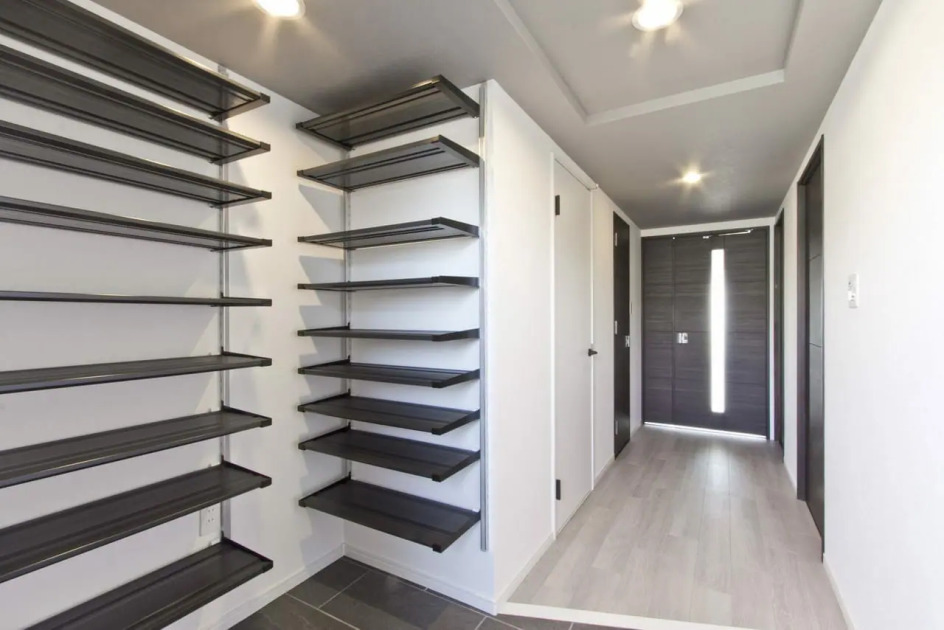 玄関のスペースは広く確保したので、一画にオープンの可動棚を設置し、シューズクローゼットとしました。