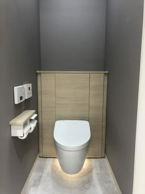 壁紙のモダンな雰囲気にあわせて、落ち着いた木目調を採用することで、おしゃれなトイレに仕上がっています。背面収納は、トイレ本体とセットで販売されているケースが多いので、メーカーのカタログから希望の商品を選びましょう。