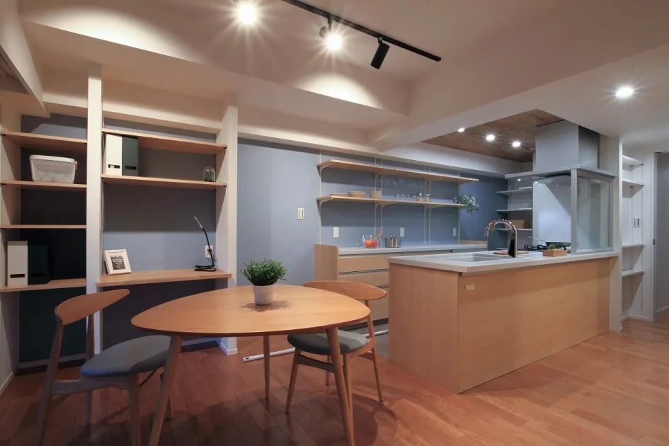 キッチンの横に棚があるワークスペースをつくることで、ダイニングやリビングで使う物を収納できるので空間がスッキリします。