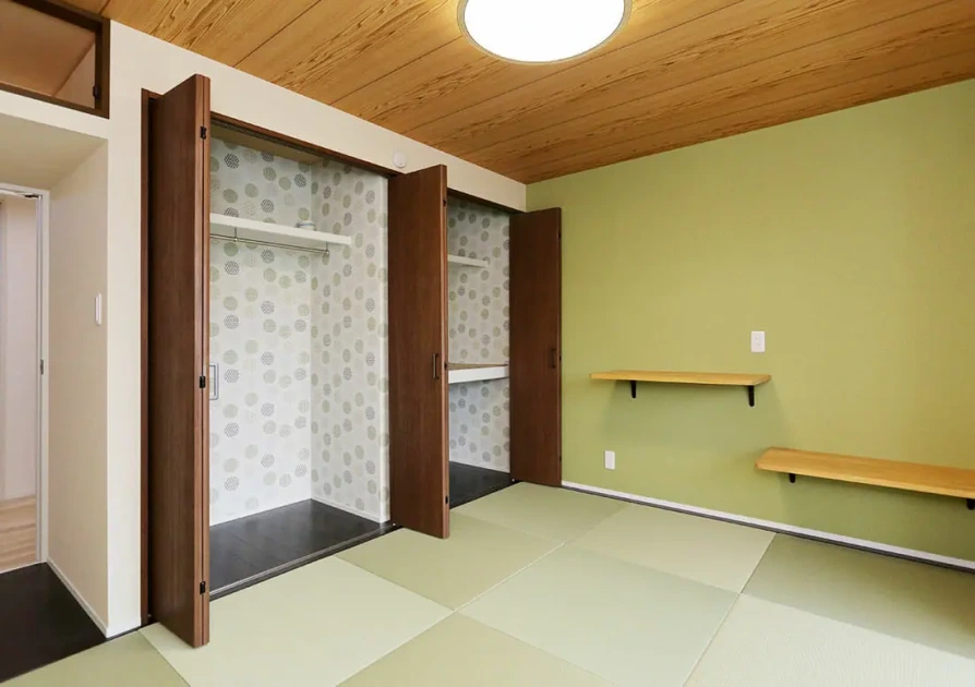 押入れから洋風の収納に変えることで、開けられる幅が広がります。幅のある物でも入れやすくなり、さまざまな収納材を設置できます。