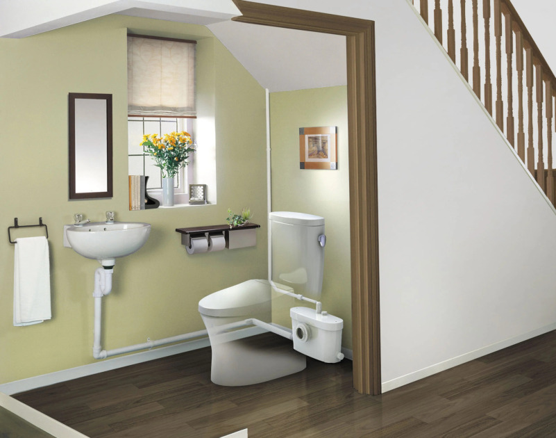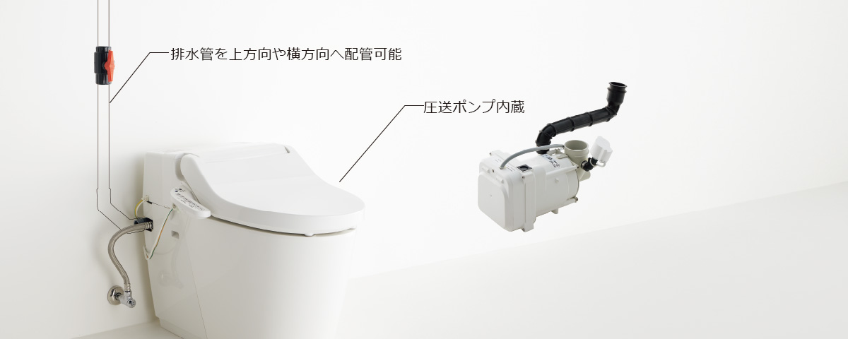 排水圧送ポンプは、トイレの真後ろや横に設置され、水を流すと内蔵されたカッターが汚水を瞬時に粉砕し、ポンプの強力な力で細い配管へと強制的に送り出します。この仕組みにより、汚水は重力に頼ることなく、水平方向に長く、あるいは垂直方向に上へと運ぶことが可能になります。