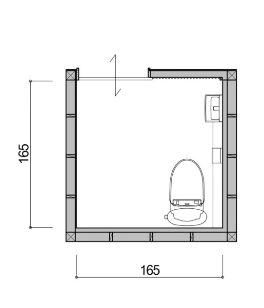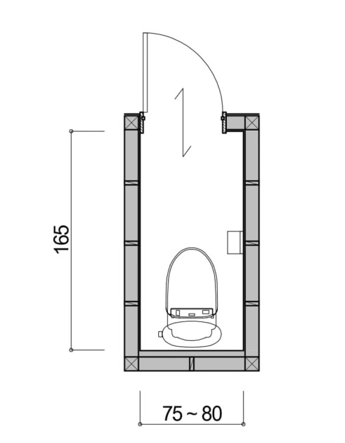 2階のサブトイレや、階段下に納める時など、やむを得ない場合にはこのような最小寸法を採用してもよいでしょう。使用に問題はありませんが、ペーパーホルダーが近すぎたり、身体の転回時に壁に触れやすいなど、狭さや圧迫感を感じることがあります。