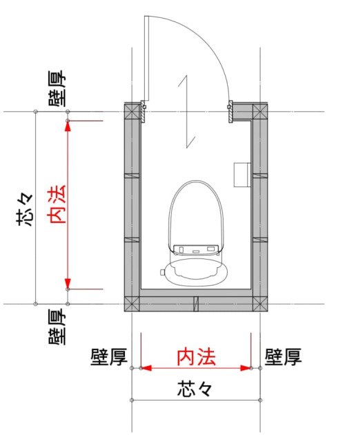 必要な内法寸法に対して、余裕のある芯々寸法を確保して計画する必要があり、特にトイレのような小さな空間では、この差は無視できないものになります。リフォーム会社と打合せする場合には、内法と芯々の寸法を間違えないようにしましょう。