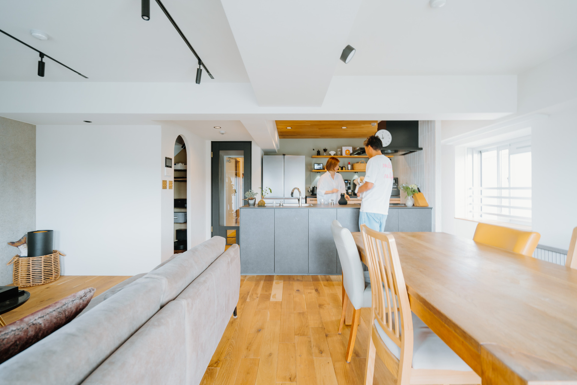 「料理をふたりでより優雅に愉しむため」半クローズドキッチンから広いオープン対面キッチンへ。ゆとりのあるキッチンの実現を夫婦で想い描いてご相談をいただきました。