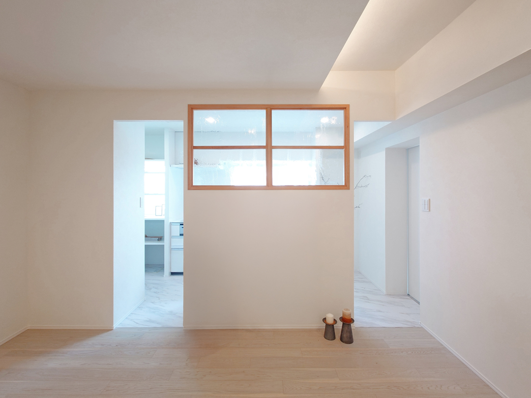 明るい日差しが差し込むマンションの南東角部屋。キッチンを東側に持っていくことで、忙しい朝にも陽光を感じられる間取りにしました。また暑さ・寒さ対策として窓に内窓をつけることで断熱性能をアップしました。