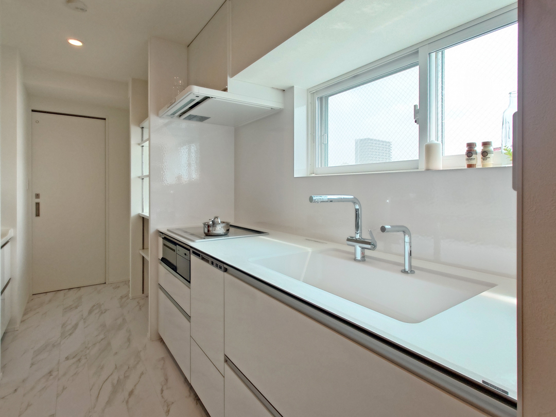 白で統一した明るいキッチン。窓は内窓をつけて断熱性能アップ。