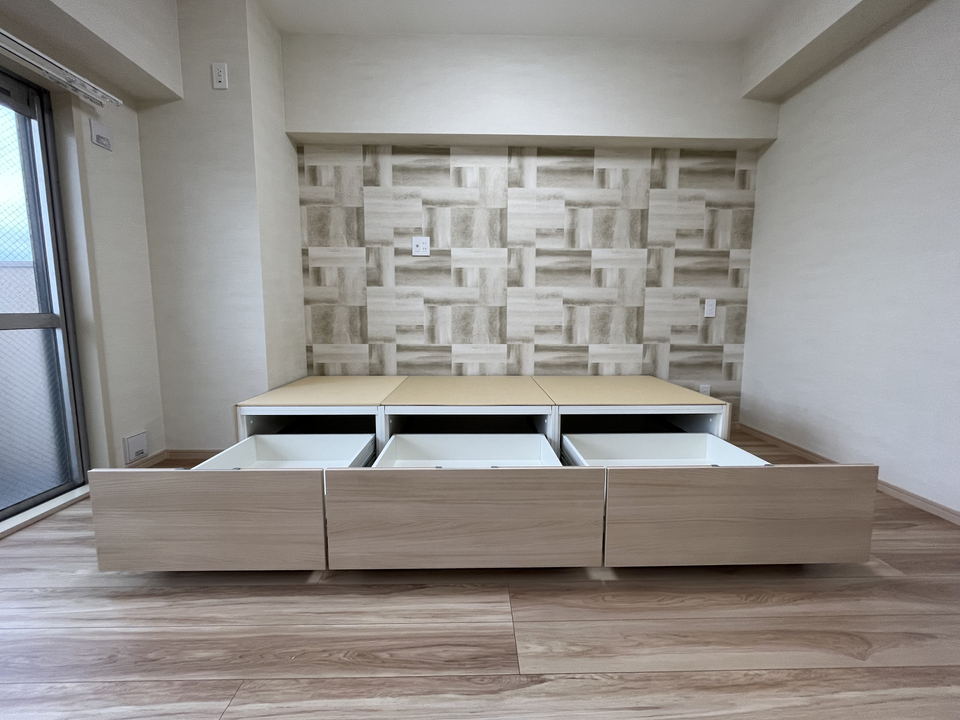 可動式の小上がりの収納を設置。壁にはアクセントクロスで変化を持たせました。