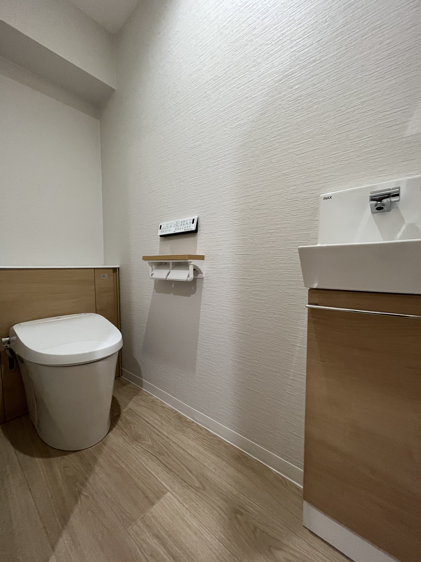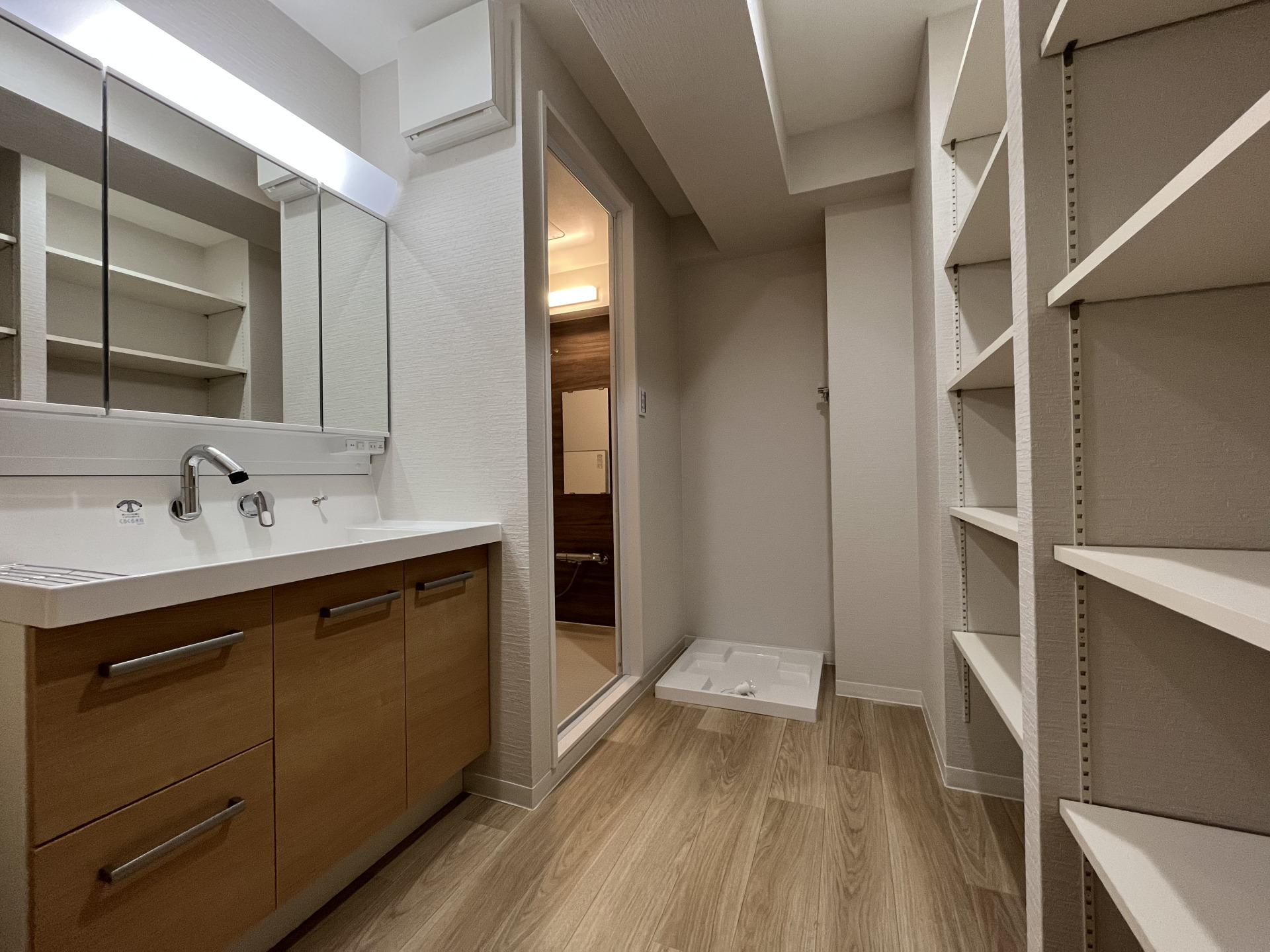 洗面化粧台を新しく、そして壁面に収納スペースを新設しました。
