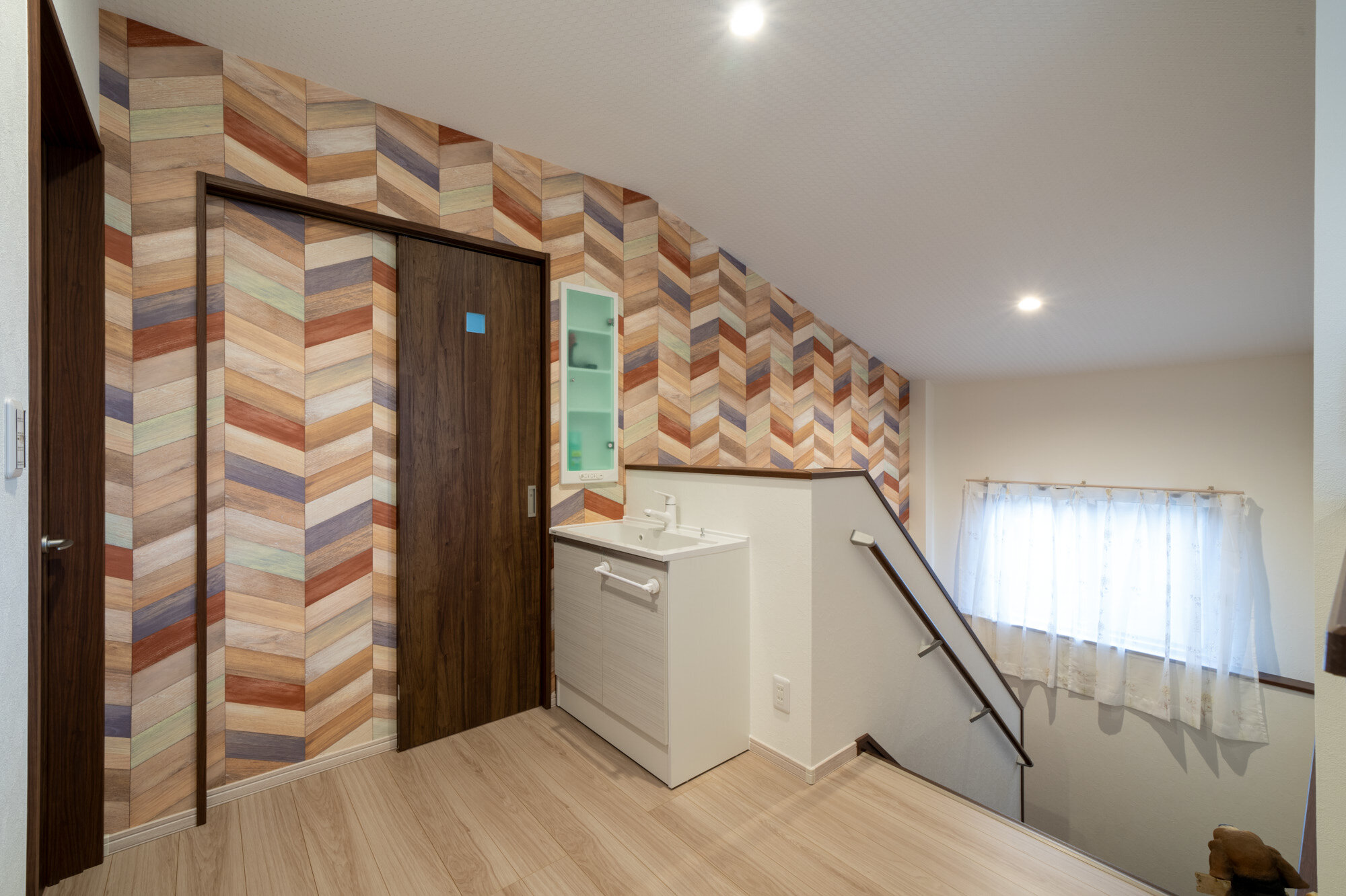 ヘリンボーン柄でダイナミックなアクセントクロスを貼った階段ホール。洗面台、トイレを2階に設けました。