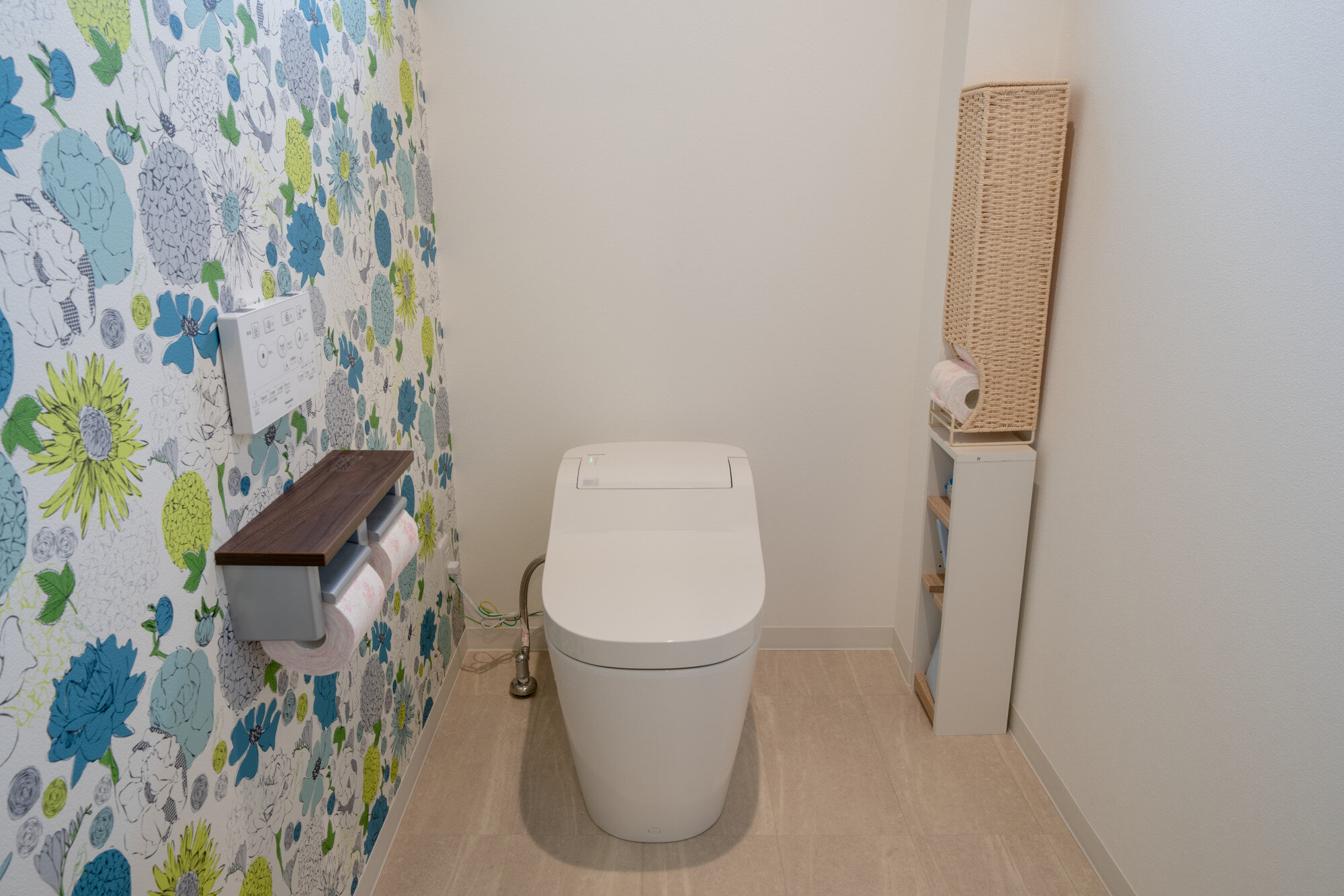 2階のトイレはタンクレスを選ばれ、1階と同じアクセントクロスを貼って華やかな印象に仕上げています。