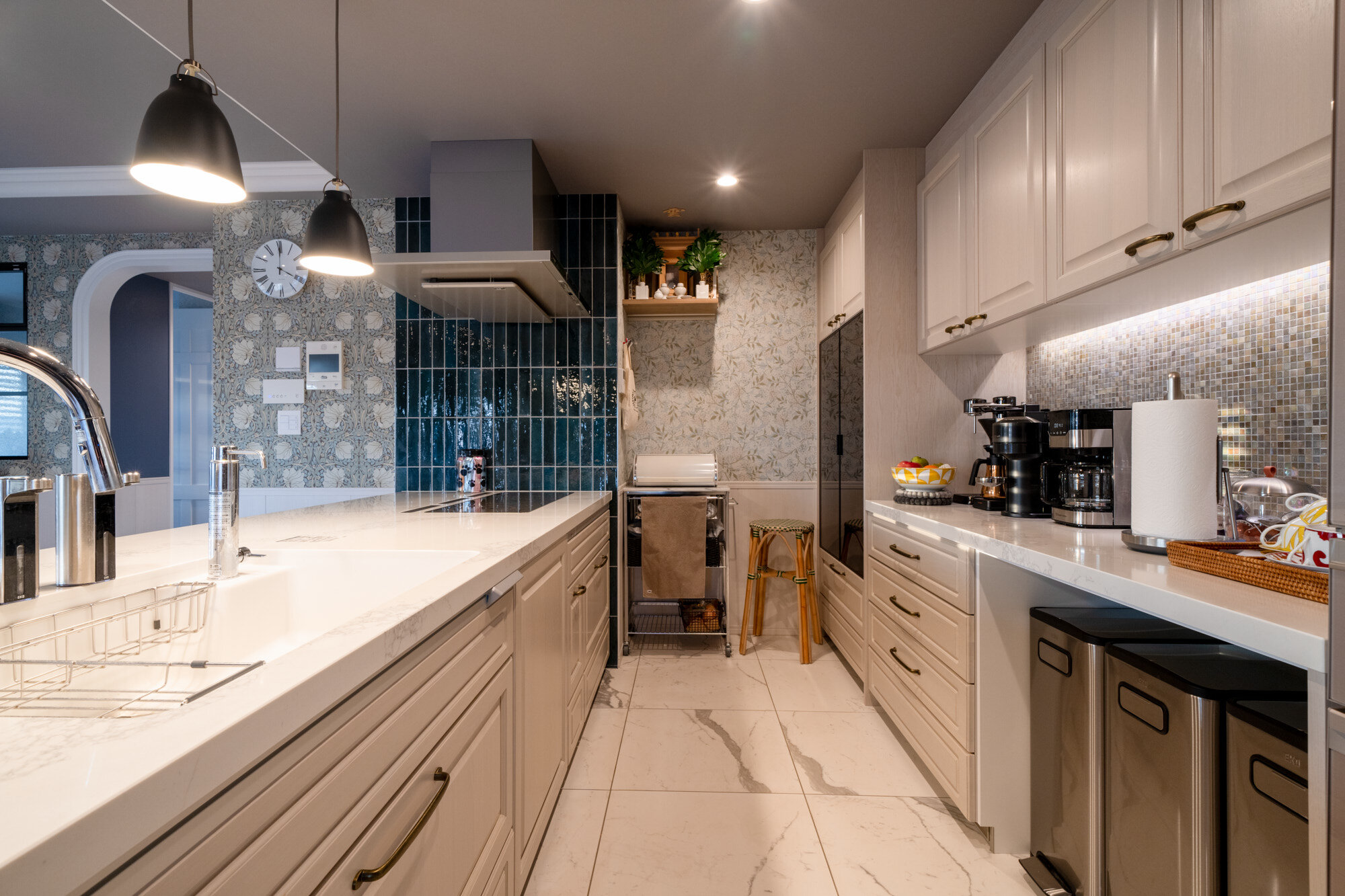 普段は使用することが少ない素材も多数選ばれたので、タイルやモールディングなどの仕上がりにも留意しています。明るすぎない海外テイストのゆとりある住まいを目指しお好みをすべて反映できて、より上質でやすらげる空間になりました。