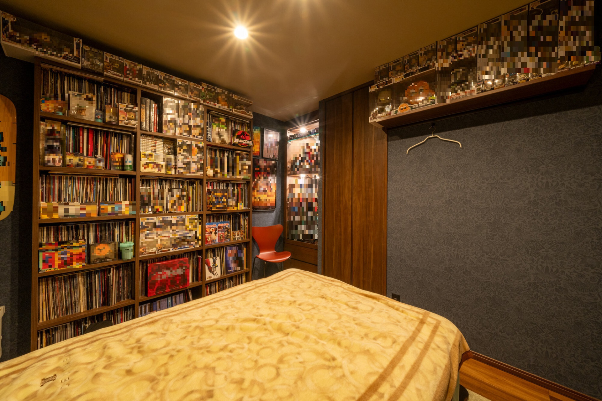 ペットドアもつけたご主人の寝室。映画のパンフレットを並べられ、フィギュア類は造作したガラスの飾り棚へ。