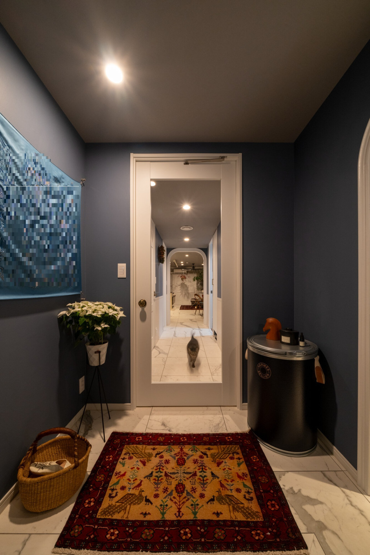 ネコのためにタイルは滑りにくいタイプを選んでいます。洋画のようなインテリアの家にしたいと思い、クロスはウィリアム・モリスで腰壁やモールディングを組み合わせました。YouTubeを参考に設備や内装材にはこだわり、光の角度によって表情が変わるベネチアンガラスのタイルが気に入っています。人もネコもゆったりと心地よく過ごせるようになりました。