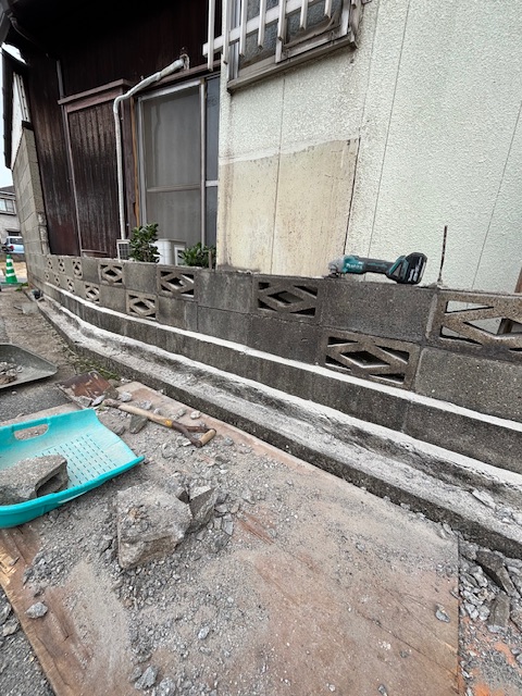 全てブロックを解体、積みなおしは予算的にオーバーするので上数段解体してフェンス取付を提案しました。
