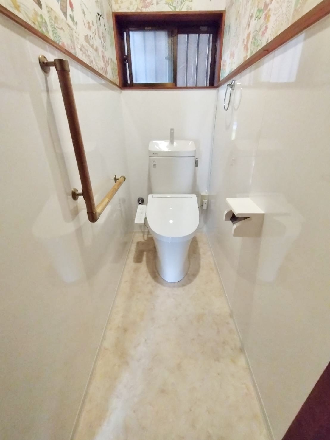 床はリリカラ製LH-81369に貼り替えました。作業はお昼前には完了いたしました。トイレ・床だけならお昼前に終わるので気軽にできます。