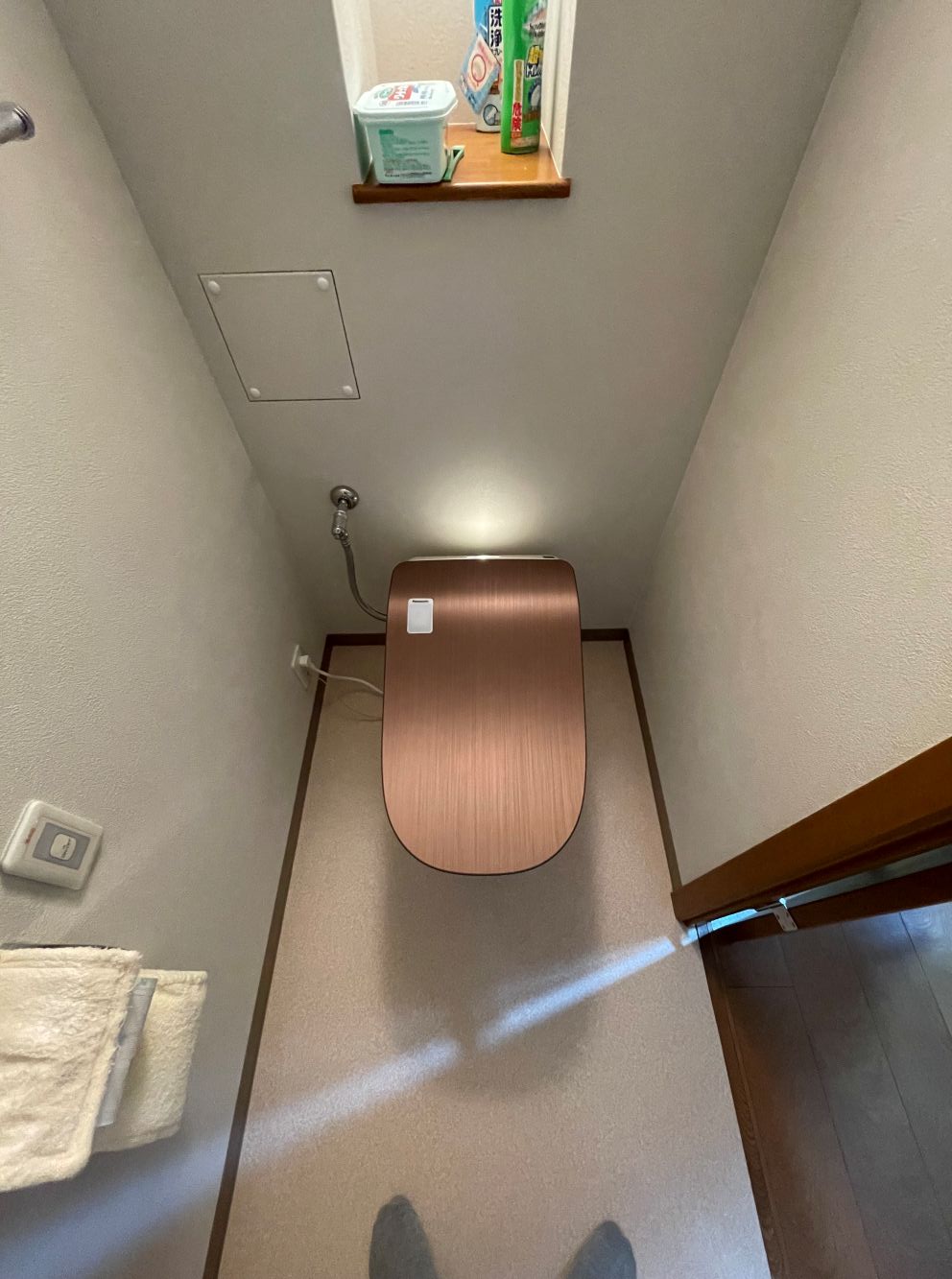Panasonic製アラウーノL150シリーズはトイレのフタの色が選べるオプションがあります。今回は銅(アカガネ)という色を選ばれました。