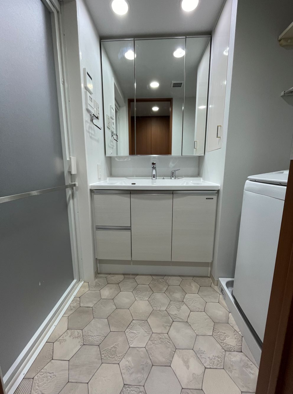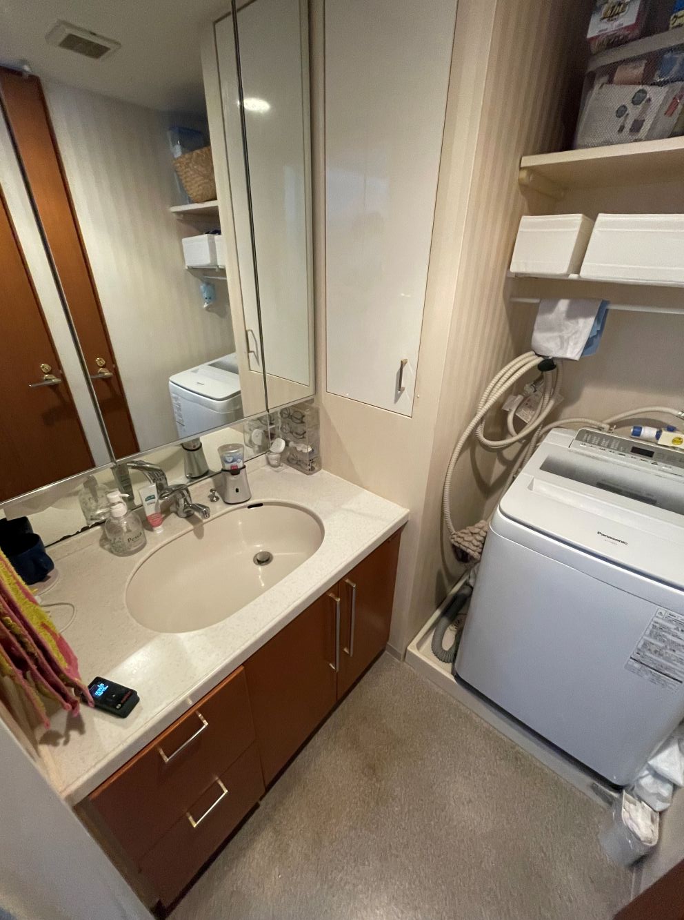 洗面台はタカラスタンダード製リジャストです。三面鏡は既存利用です。
