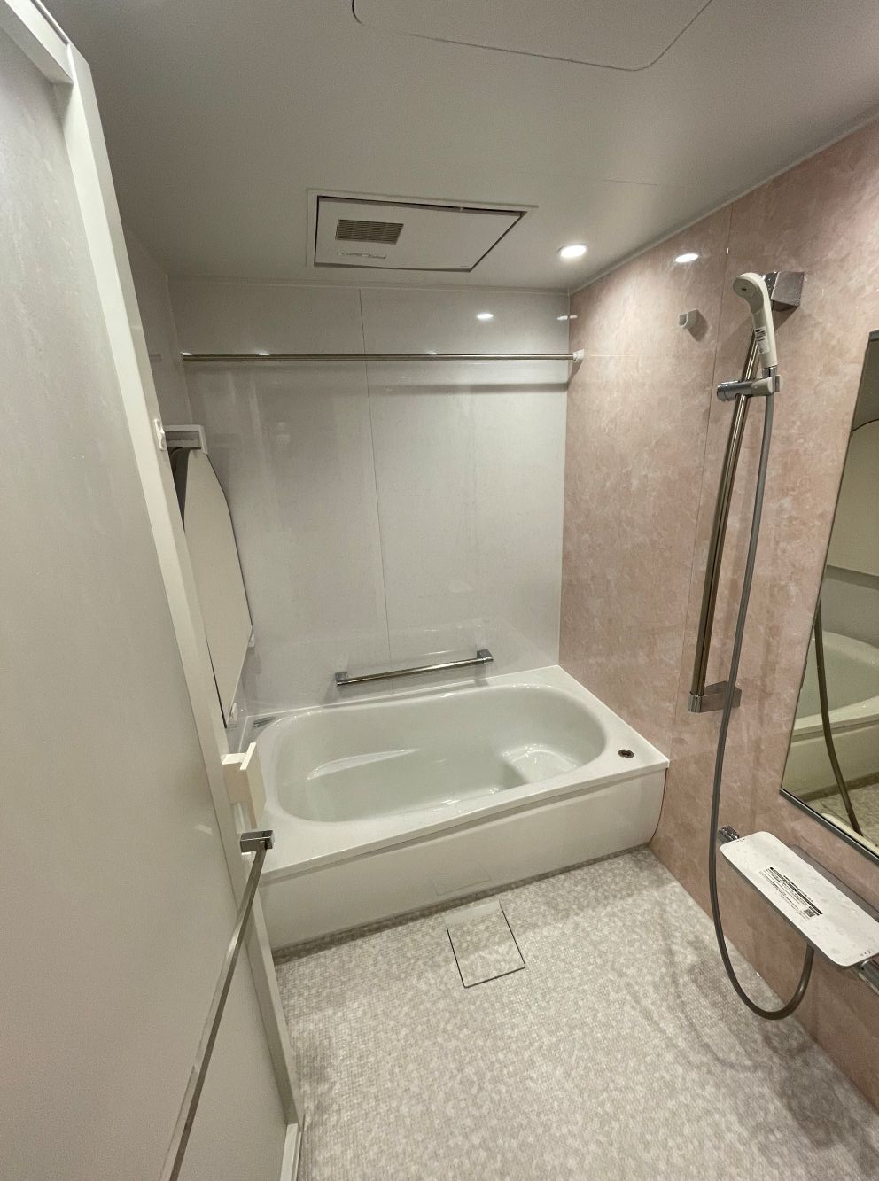 ユニットバスはTOTO製WYシリーズXタイプです。壁は大理石柄のピンクでとても華やかになりました。