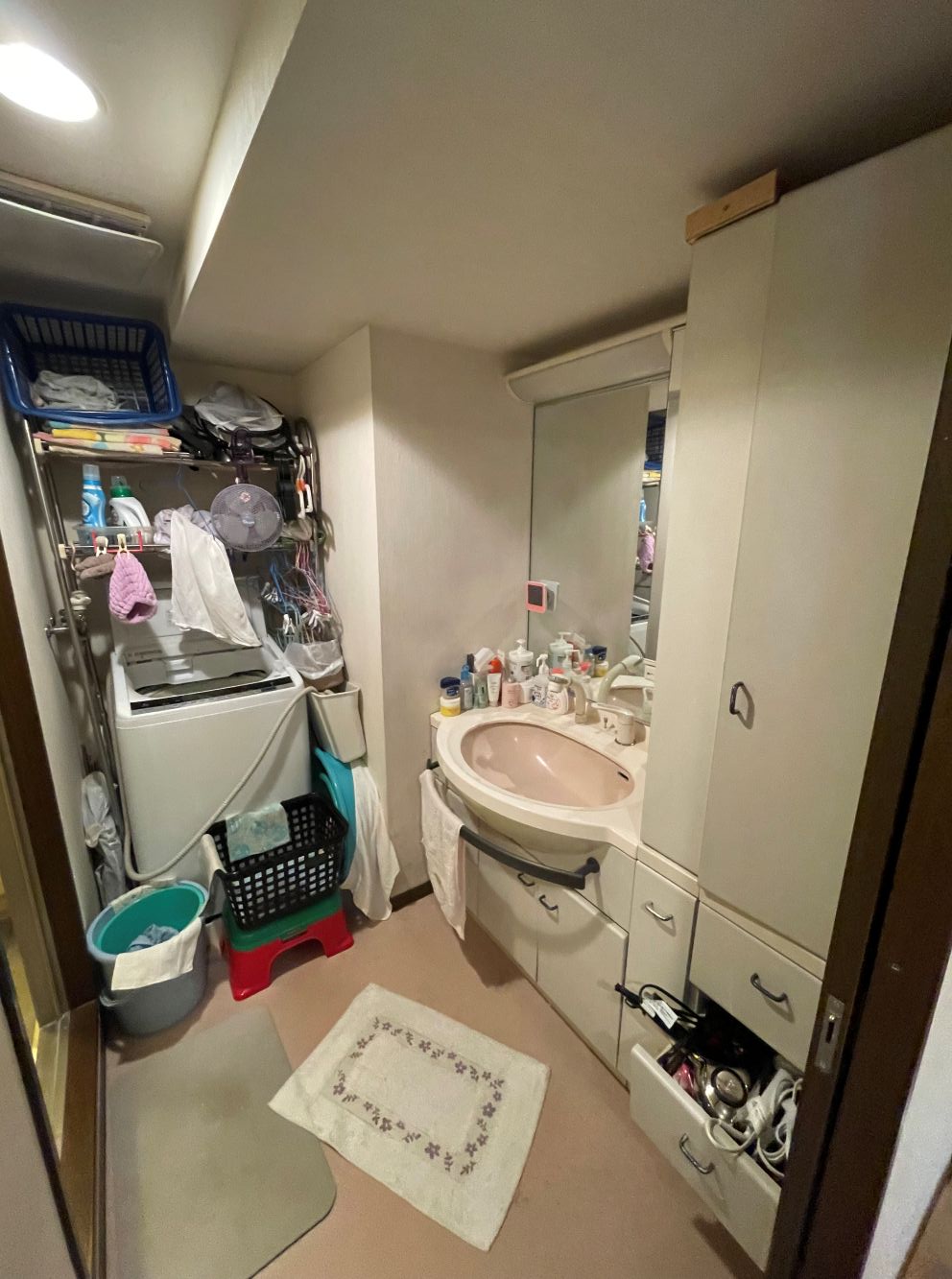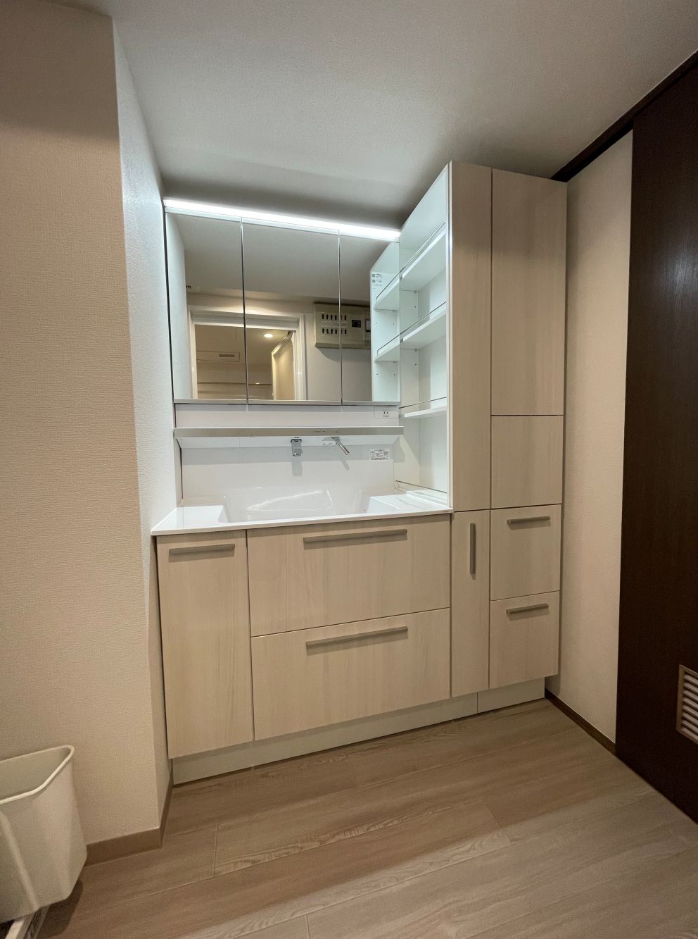洗面台はTOTO製オクターブをお選びいただきました。洗面台横の収納棚もセットで新しくしました。