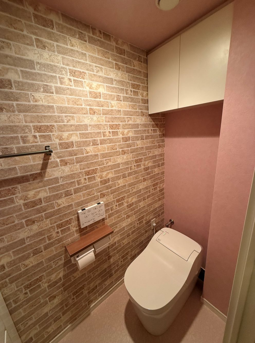 室内の内装貼り替え、紙巻器を交換をしました。ピンクが好きなのでピンクとレンガ柄で可愛い室内になりました。