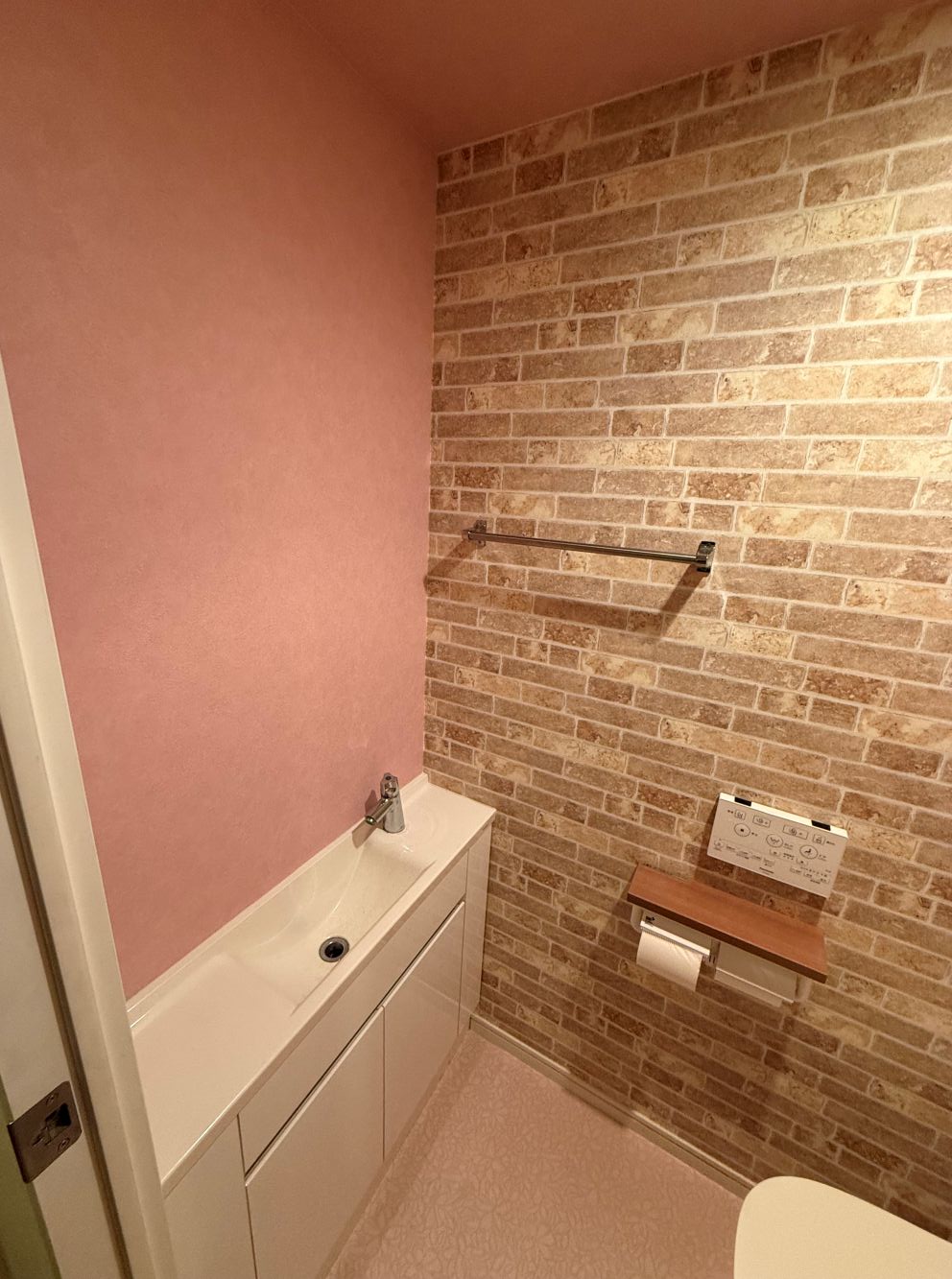 ピンクとレンガ柄のクロスで可愛い雰囲気になりました。手洗器は既存利用です。