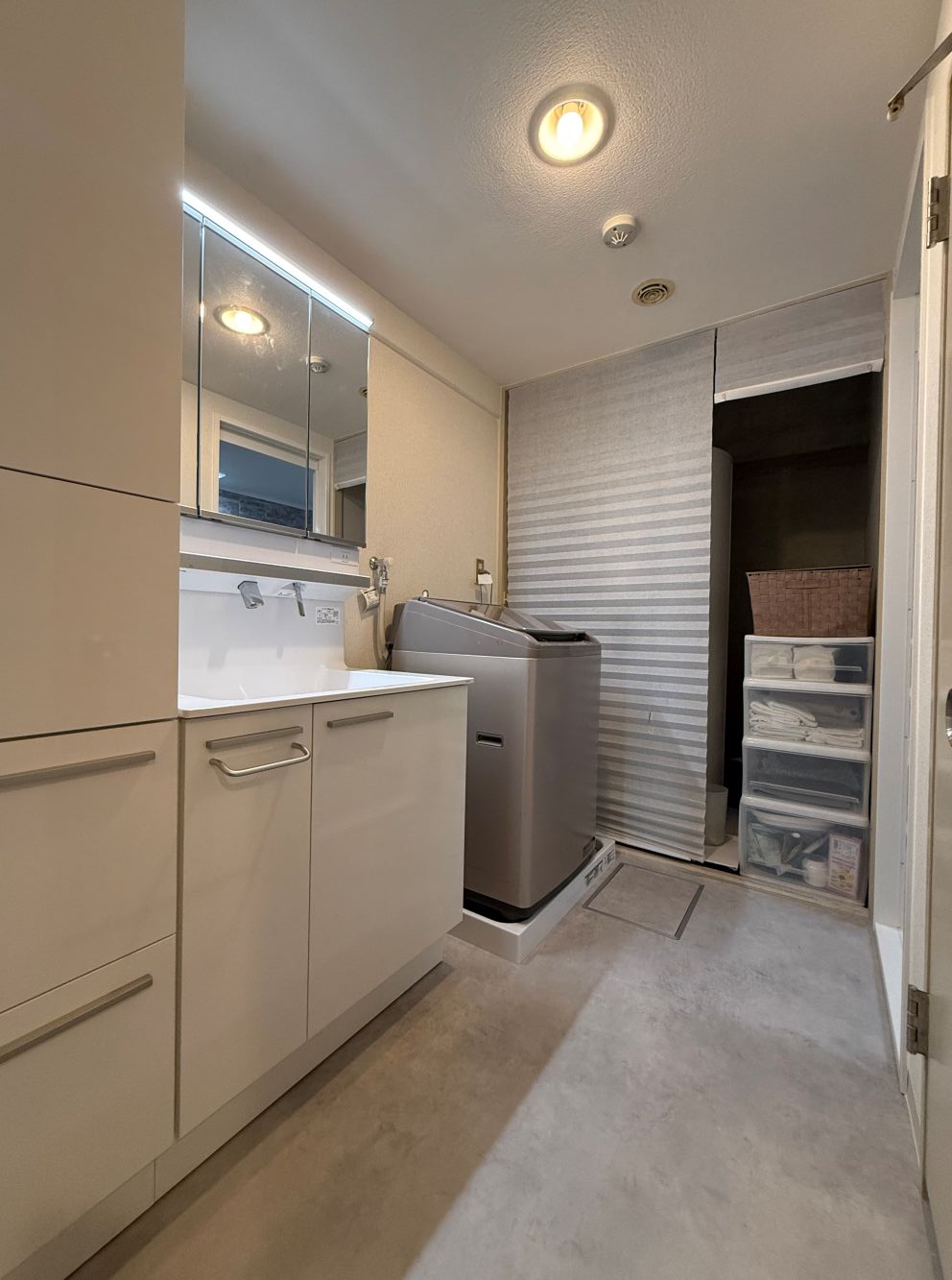 洗面台はTOTO製オクターブです。洗面台の左に収納棚を設置しました。