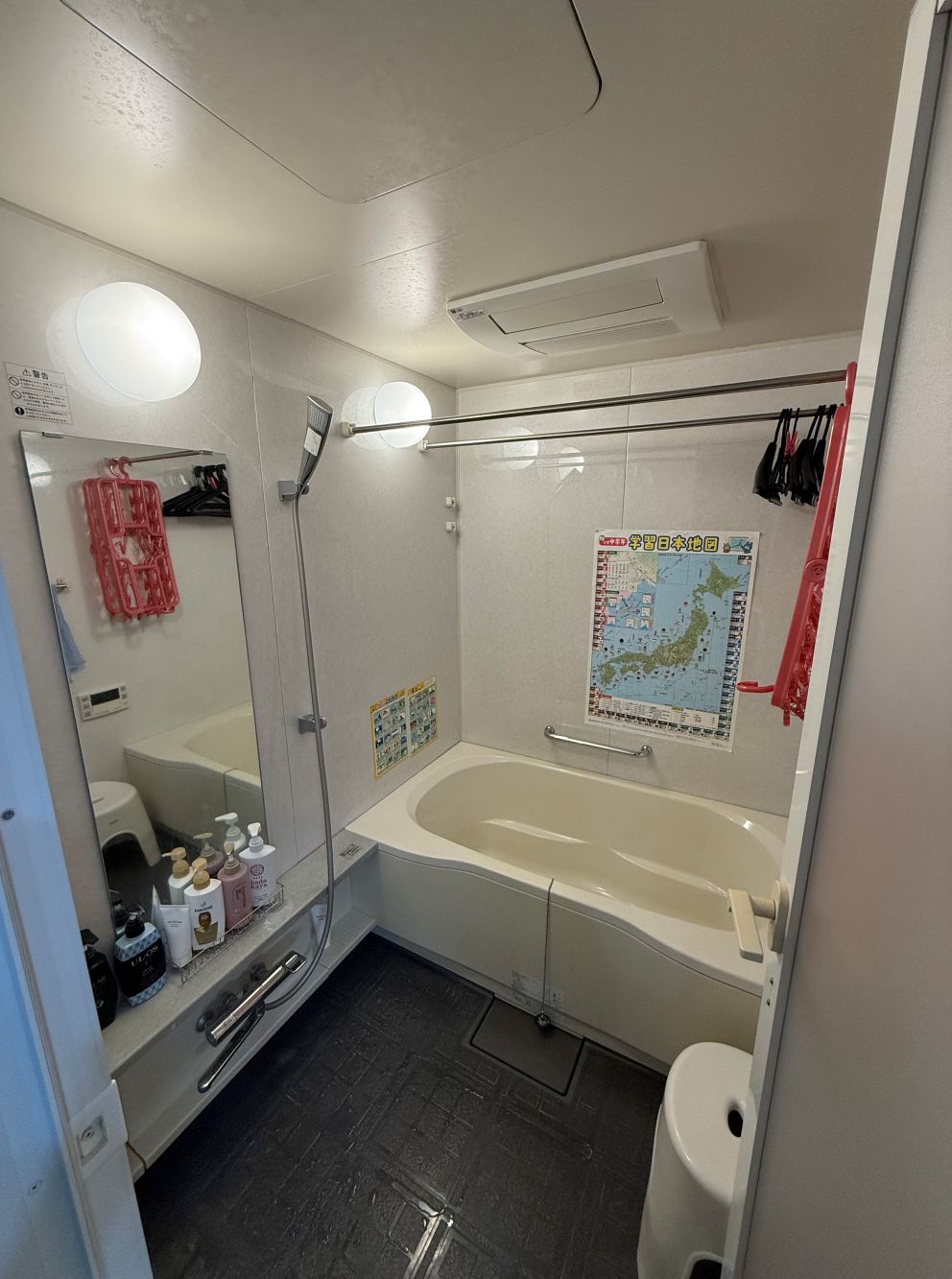 浴槽には楽湯という、肩と腰からジェットバスのように水流が出る機能が付いています。素材は人工大理石です。