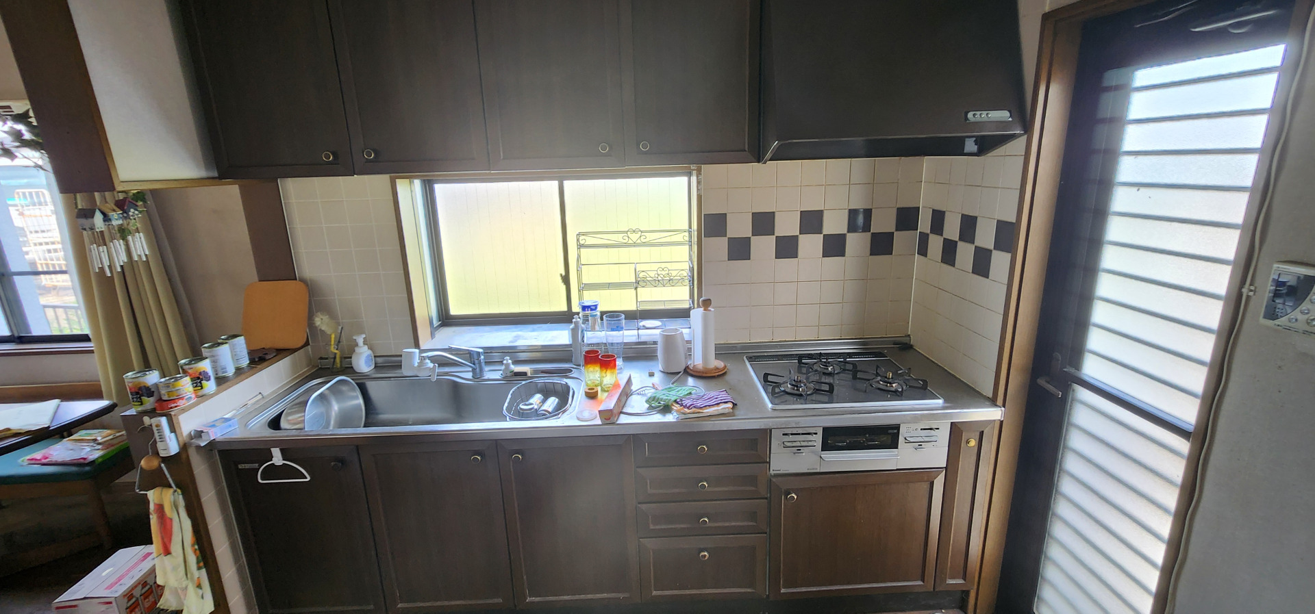 既存のタイルを剥し掃除しやすいキッチンパネルを採用しました。 収納は使いやすい引き出しタイプのキッチンを提案しました。