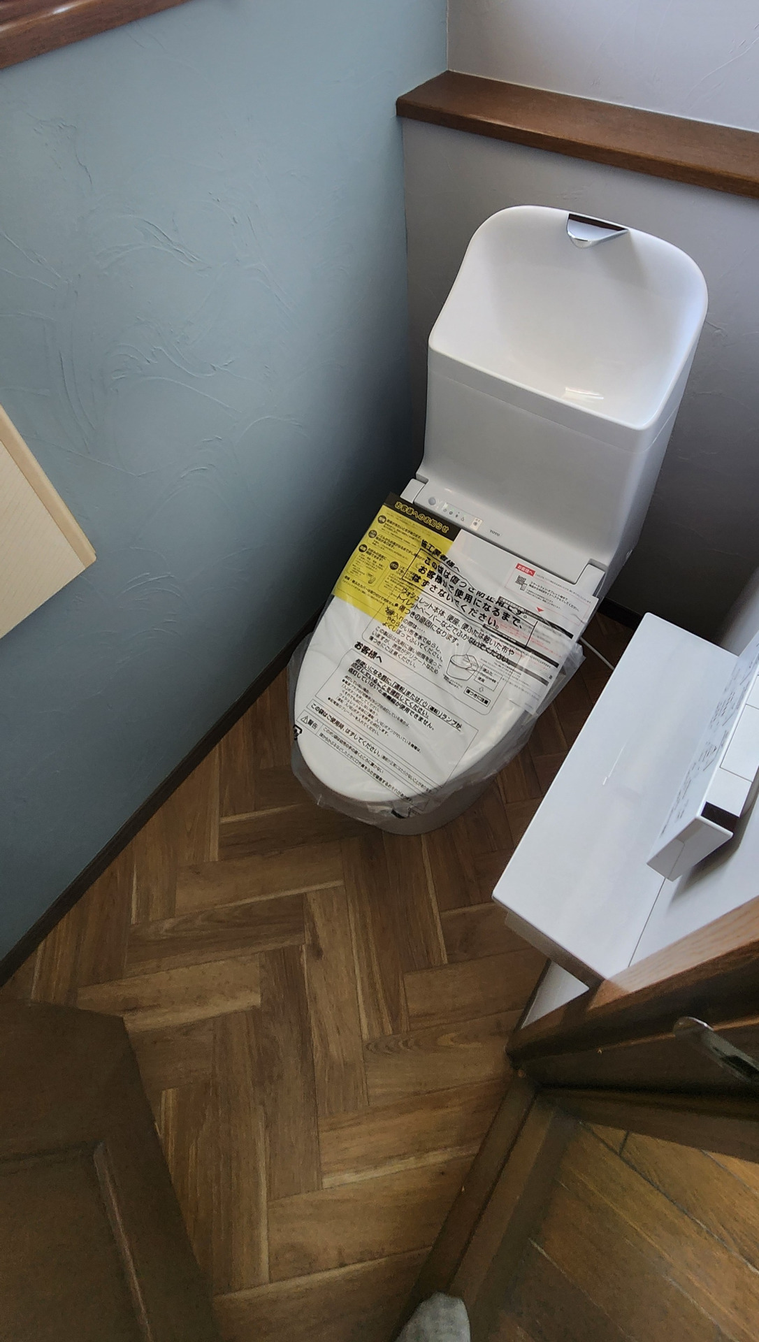 トイレはTOTOのZJ1を採用。壁は調湿・消臭効果の高い塗り壁を施工しました。ヘリンボーンの床が素敵です。