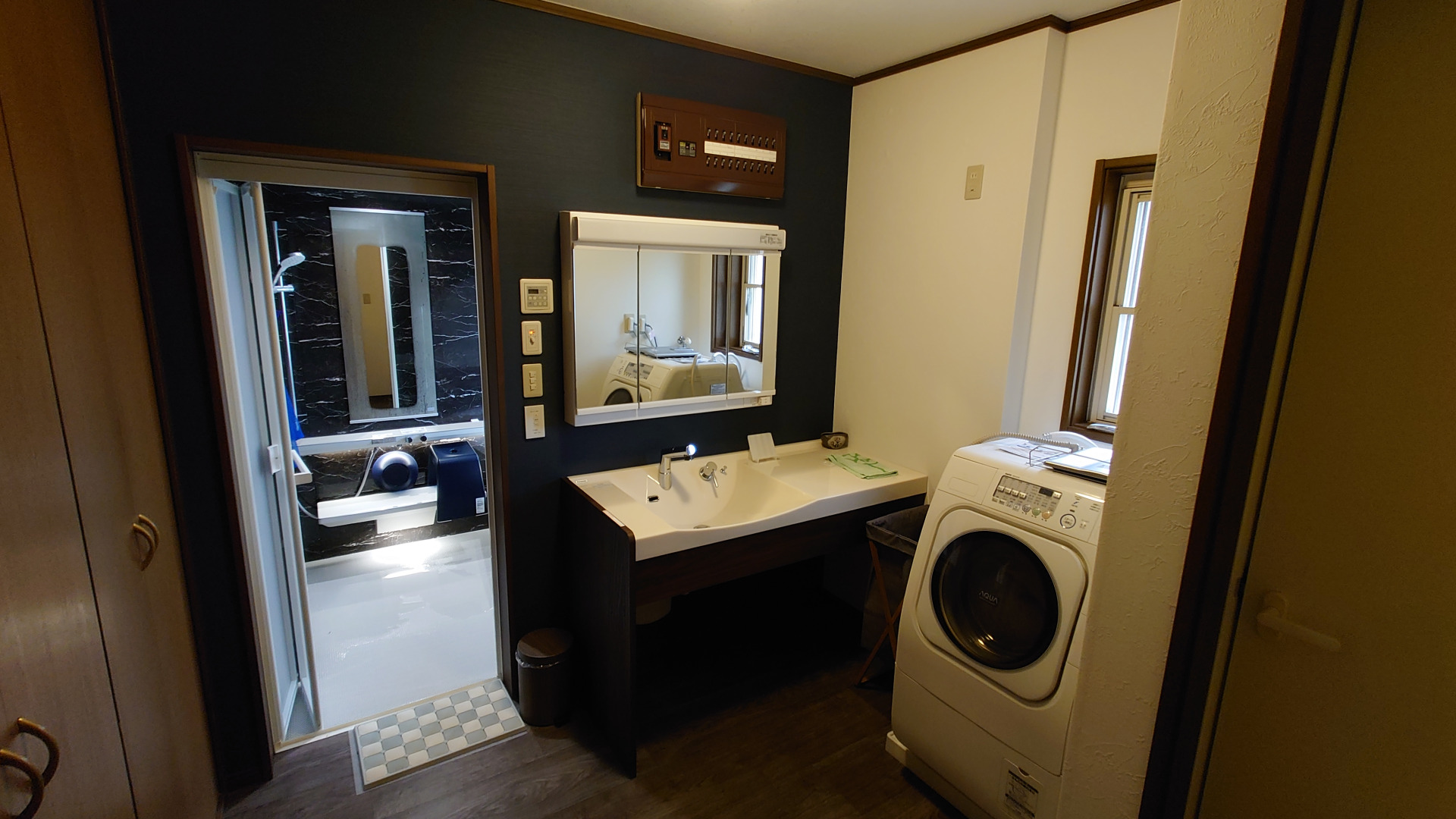 浴室はダークトーンの壁パネルとワイドミラーを採用し、落ち着いた上質な空間に仕上げました。 脱衣室は明るい内装材と使いやすい洗面化粧台を選定し、洗濯機まわりの動線や収納性にも配慮しています。 断熱性やお手入れのしやすさにもこだわり、長く快適に使える水まわりを目指しました。