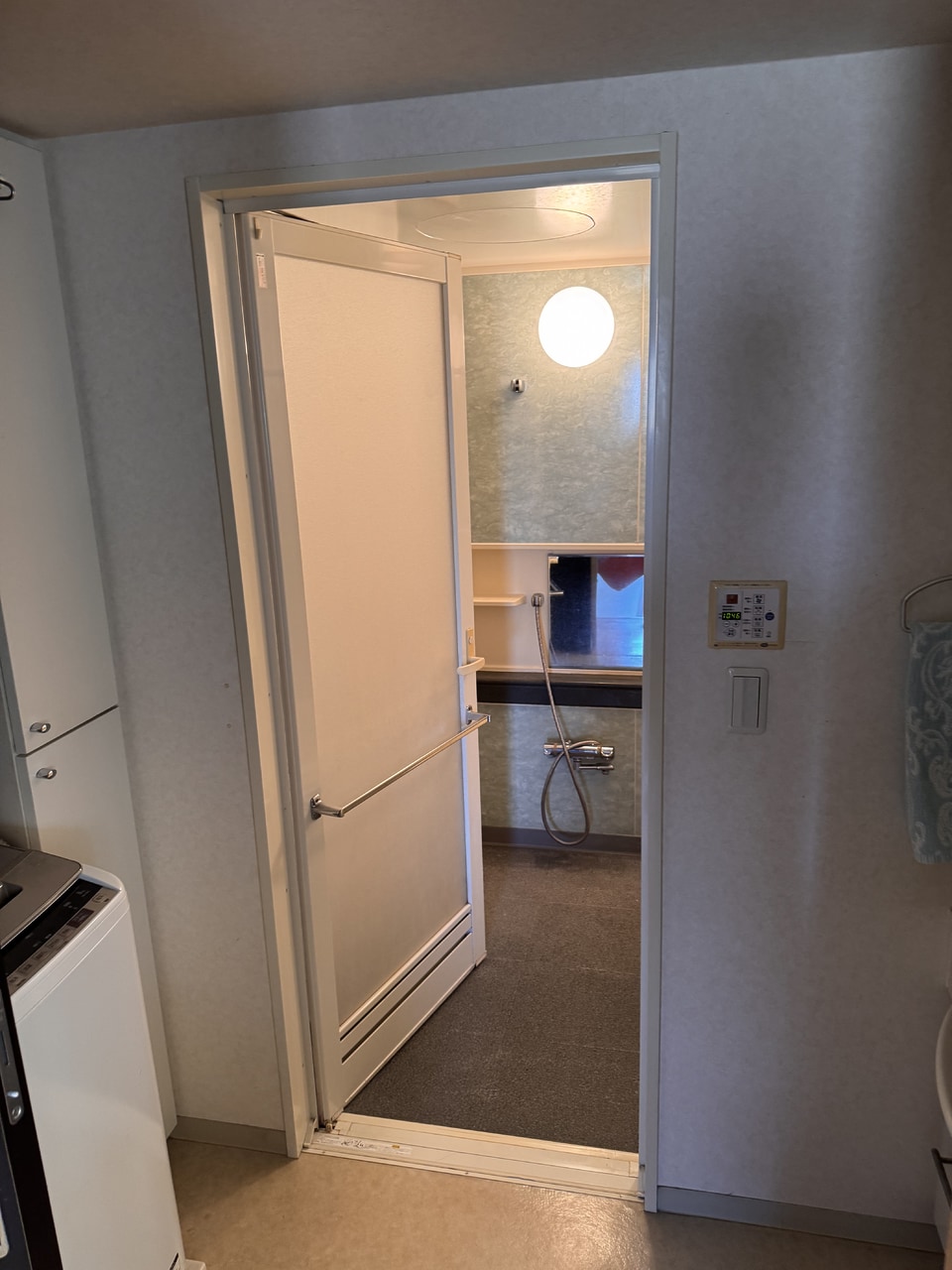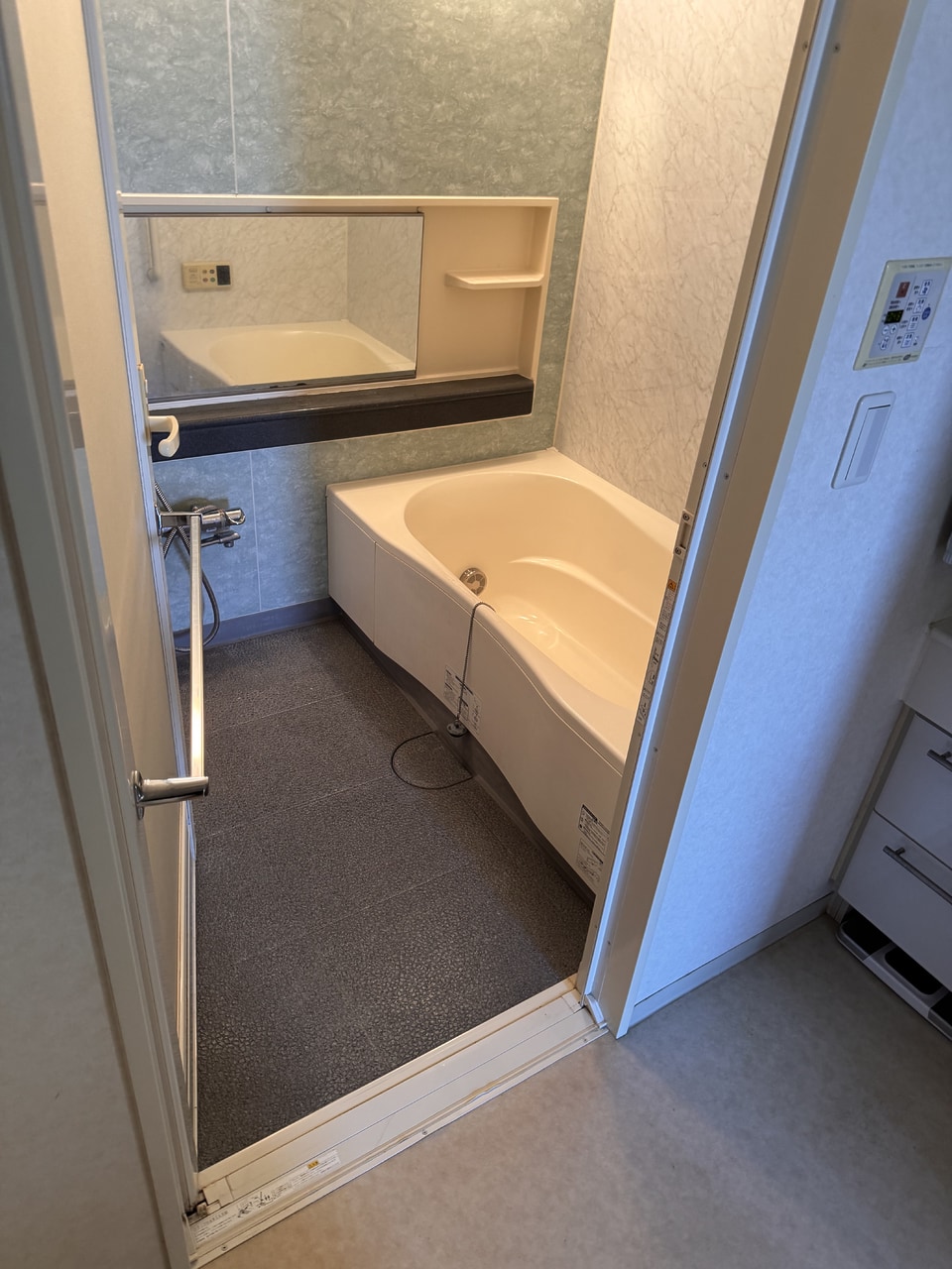 既存のドアサイズに近い新しいシステムバスを選定。足りない部分はキッチンパネルや樹脂枠材などでドア枠周りを補修します。