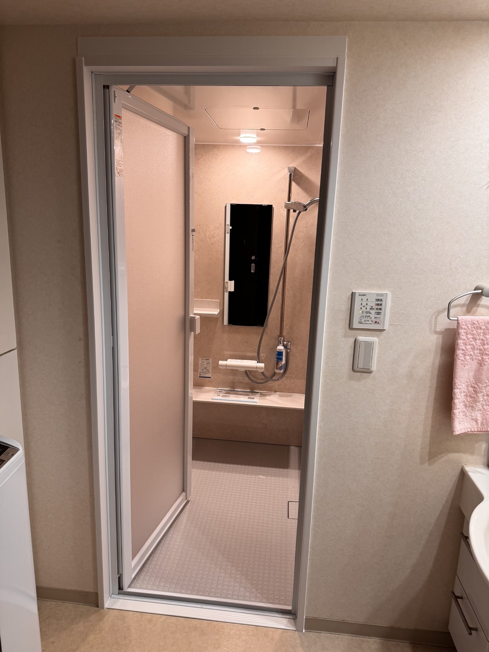3室換気乾燥暖房機(温水式)は浴室メーカーのオプションに存在しないため、換気扇メーカー(今回は三菱)に別注し現場対応しました。 浴室設置工事の際に実際の商品で手すりの高さを確認し使いやすい高さに設置させて頂きました。