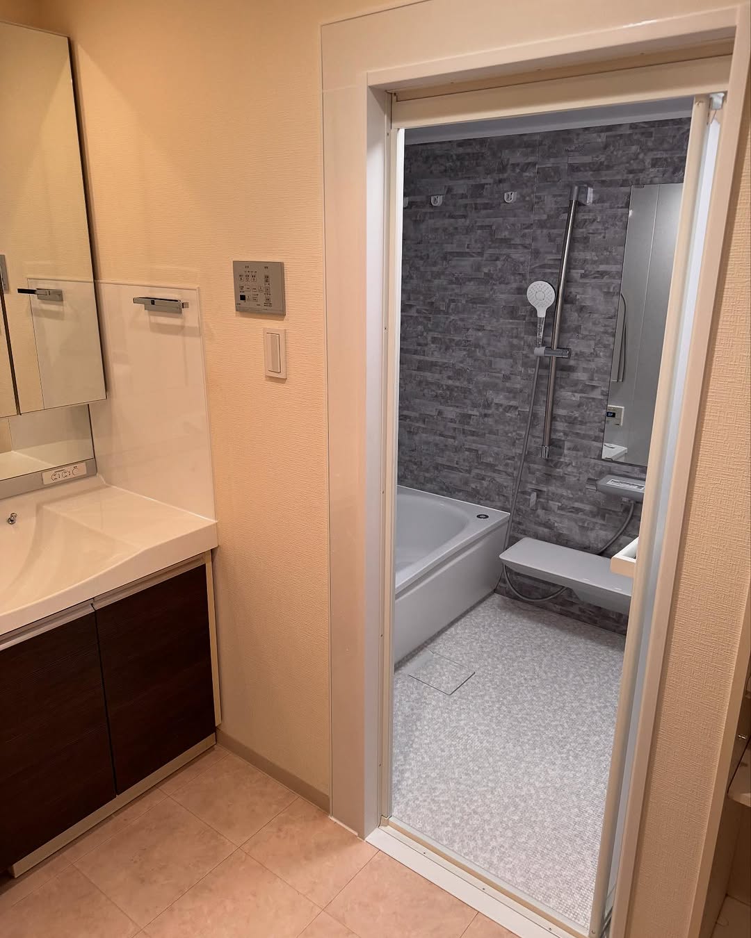 既存の浴室サイズに合わせた納まりになるよう慎重に採寸し、給排水や電気の位置を微調整して施工しました。 洗面カウンターまわりやドア枠まわりはキッチンパネルを丁寧に貼り、見た目と清掃性の両立を意識しました。