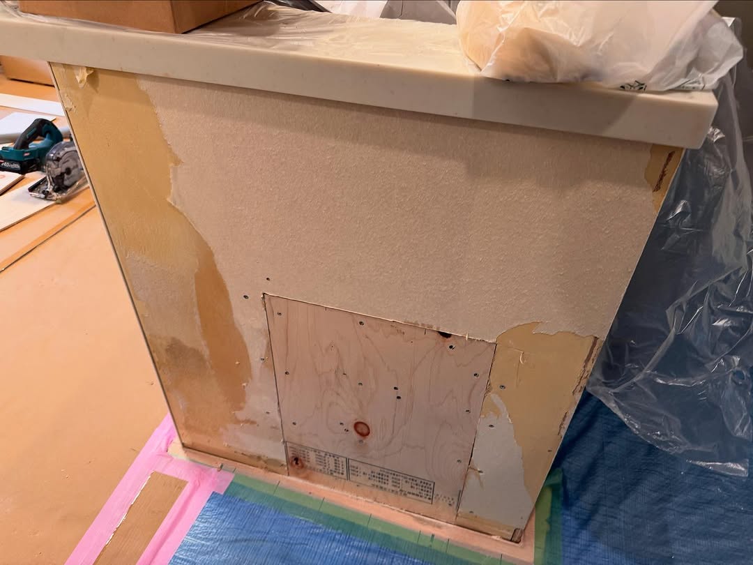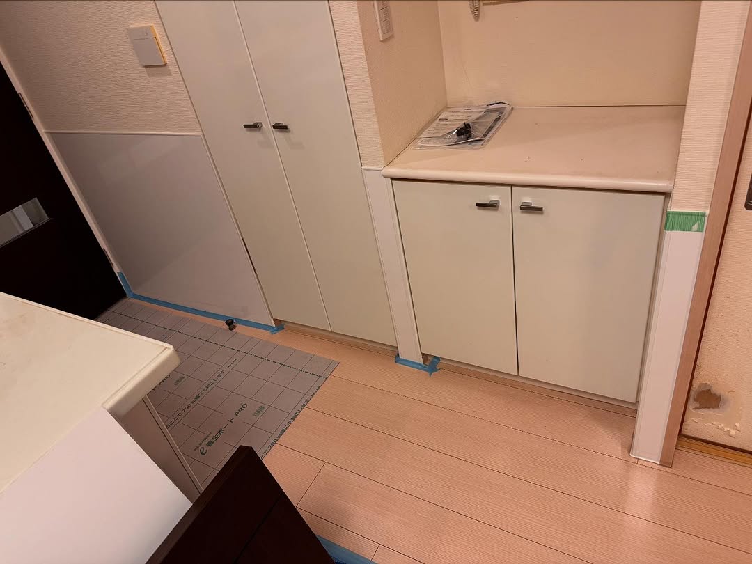 既存の巾木や出隅との取り合いに注意しながら、パネルの継ぎ目を丁寧に合わせて施工しました。 表面に光沢のあるホワイト系パネルを採用し、室内が広く見えるよう仕上げています。