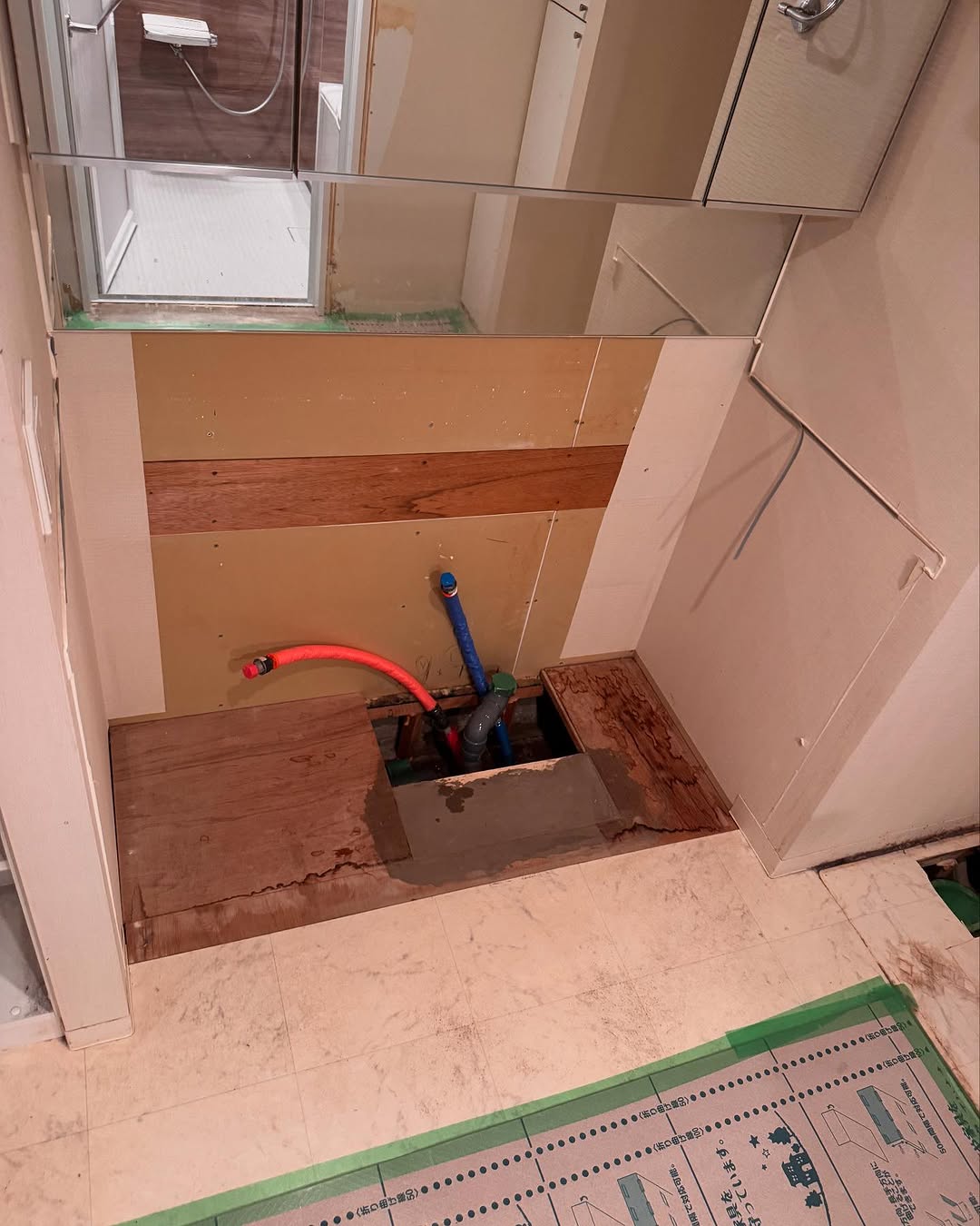 既存配管の位置を正確に測定し、浴槽の据付寸法をミリ単位で調整しました。 既設の排水ルートを活かしつつ、勾配と高さを見直して水漏れ・詰まりのリスクを軽減。 また、浴室ドアの下枠高さを洗面室床とそろえ、つまずきのない安全な動線に仕上げています。