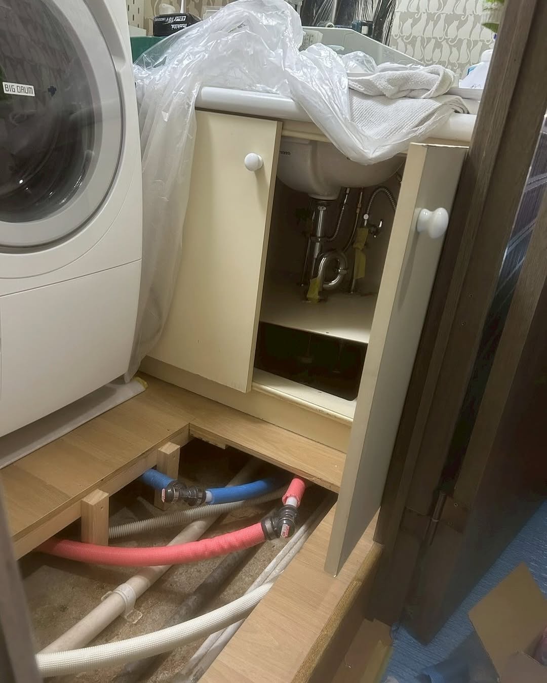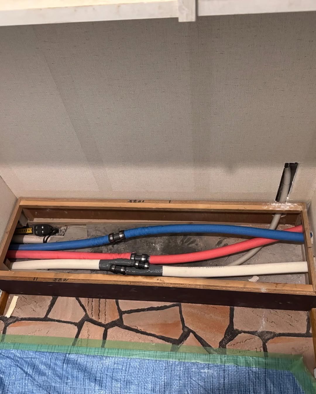 まずは給水・給湯・追い焚き配管を全て新しい配管へ更新しました。 そして今回のポイントは、ユニットバスを1216 → 13165へサイズアップしたこと。 ・短辺側は壁とのクリアランス2mmというギリギリの納まり ・長辺側はRC壁との兼ね合いから、ドア位置を100mm移動 ・最終仕上げはお客様と相談のうえ、クロス巻きからキッチンパネル仕上げへ変更 限られたスペースの中で寸法を最大限活かすため、 構造や納まりを一つずつ検証しながら進めました。 自社施工の強みを活かし、現場で柔軟に調整しながら実現したサイズアップです。