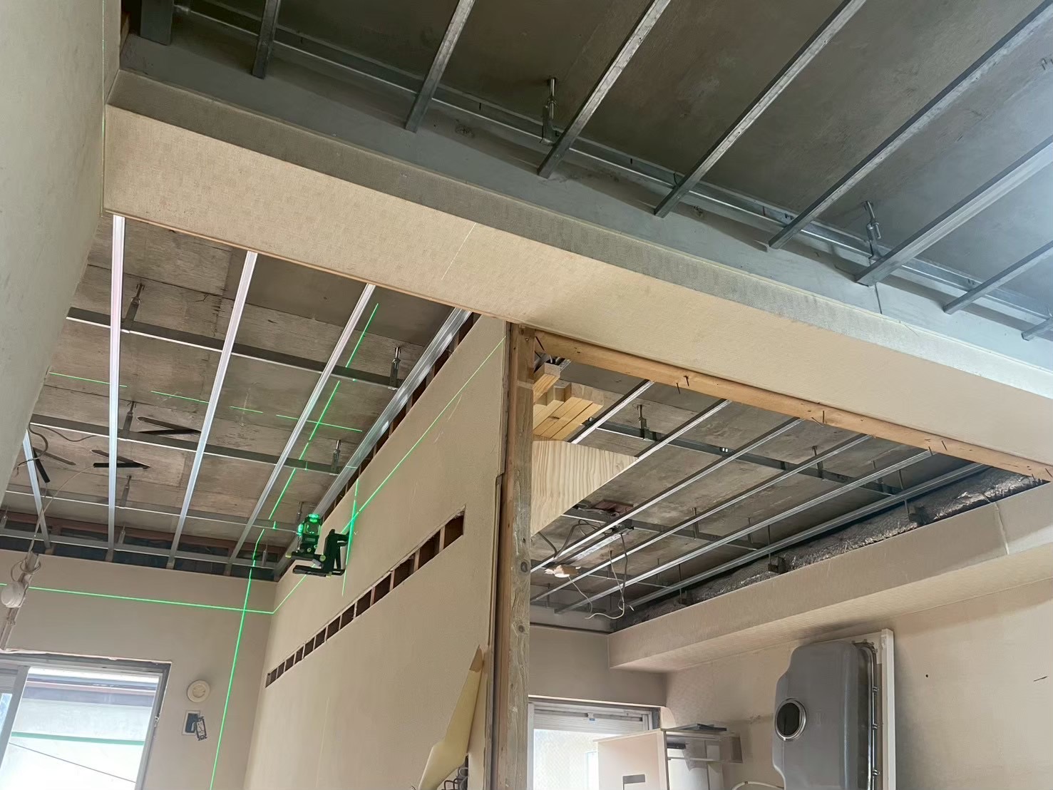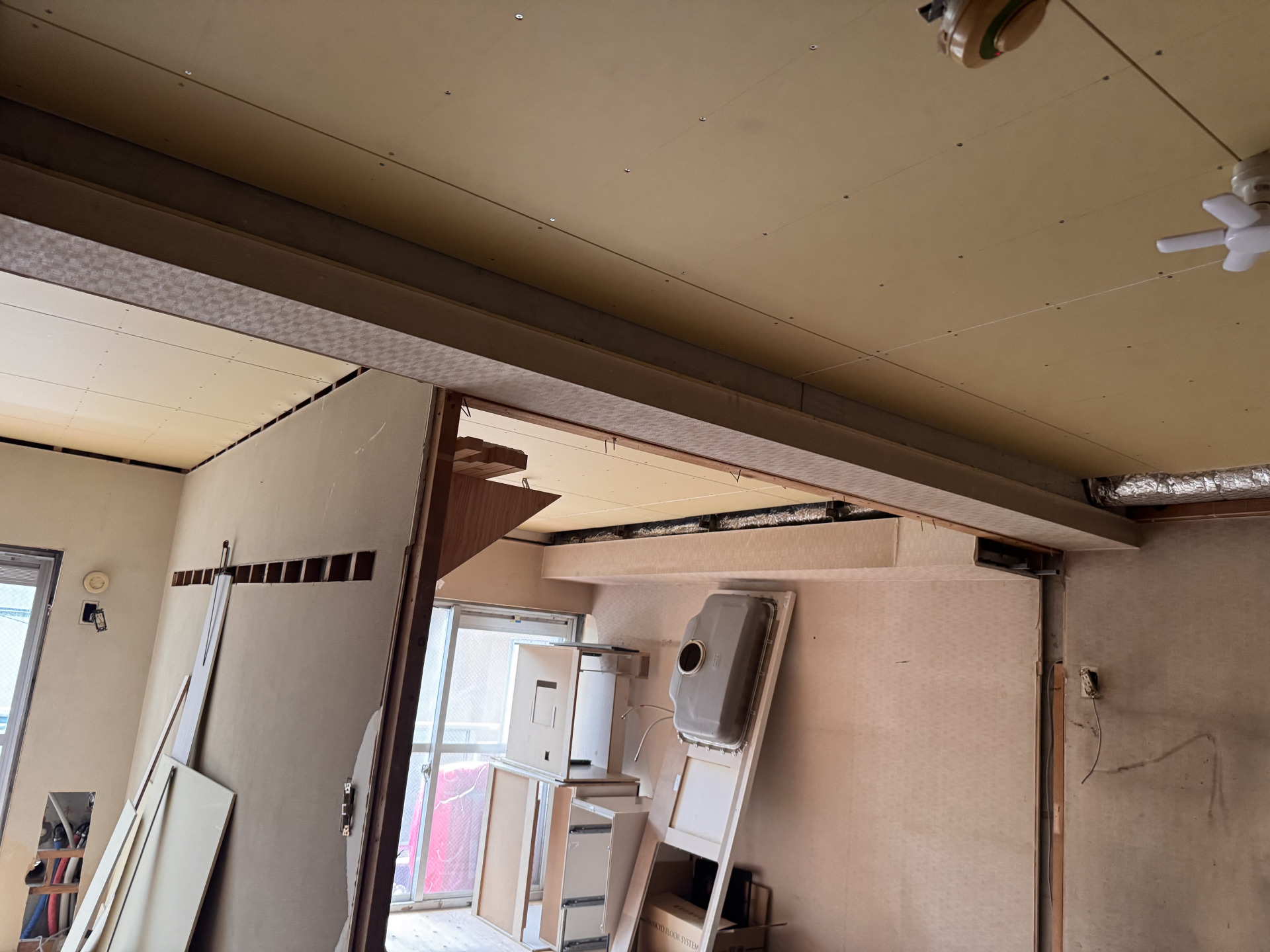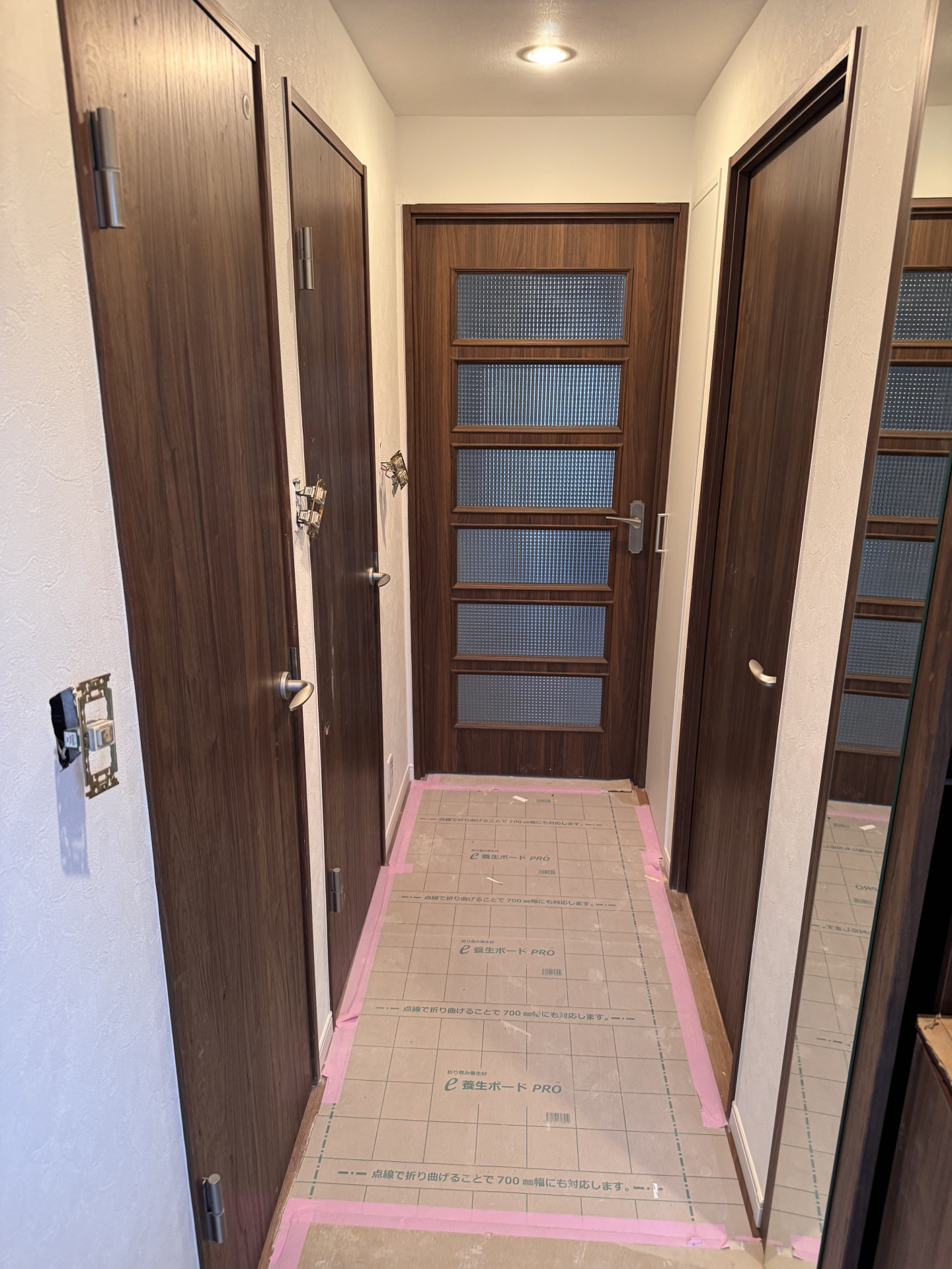 段差をなくすために床構造をすべてやり替え、置床の高さや納まりを細かく調整しました。 床が上がる分、天井の一部を上げて圧迫感を軽減し、開放感のある空間に。 さらに、建具の開閉位置や動線も見直し、暮らしやすさとデザイン性の両立を図りました。 思い出の扉は下地処理を丁寧に行い、シート貼りで自然な質感に仕上げています。