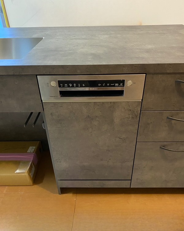限られたスペースを有効に使うため、 壁面に可動棚を設けて収納力をアップ。 床はお手入れがしやすいクッションフロアを採用し、 長く清潔に使えるようにしました。 内装の色味や素材はすべてお客様がじっくり選ばれ、 ウォールナット調の扉との調和がとても美しい仕上がりになりました。