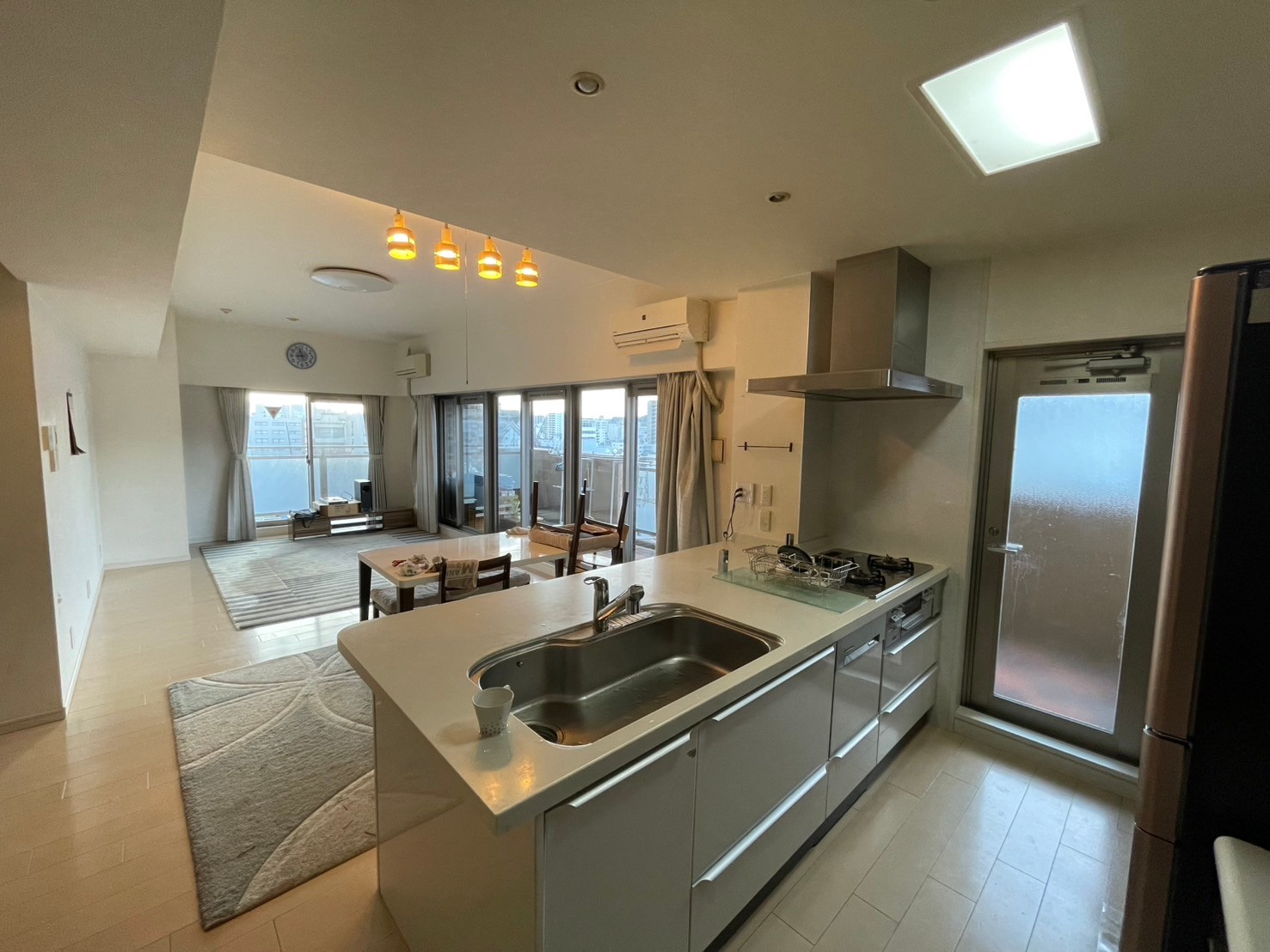 キッチンをメインにした空間作り マテリアル調で統一した内装デザイン ホテルライクな空間にする為に、鏡面調の床材の提案